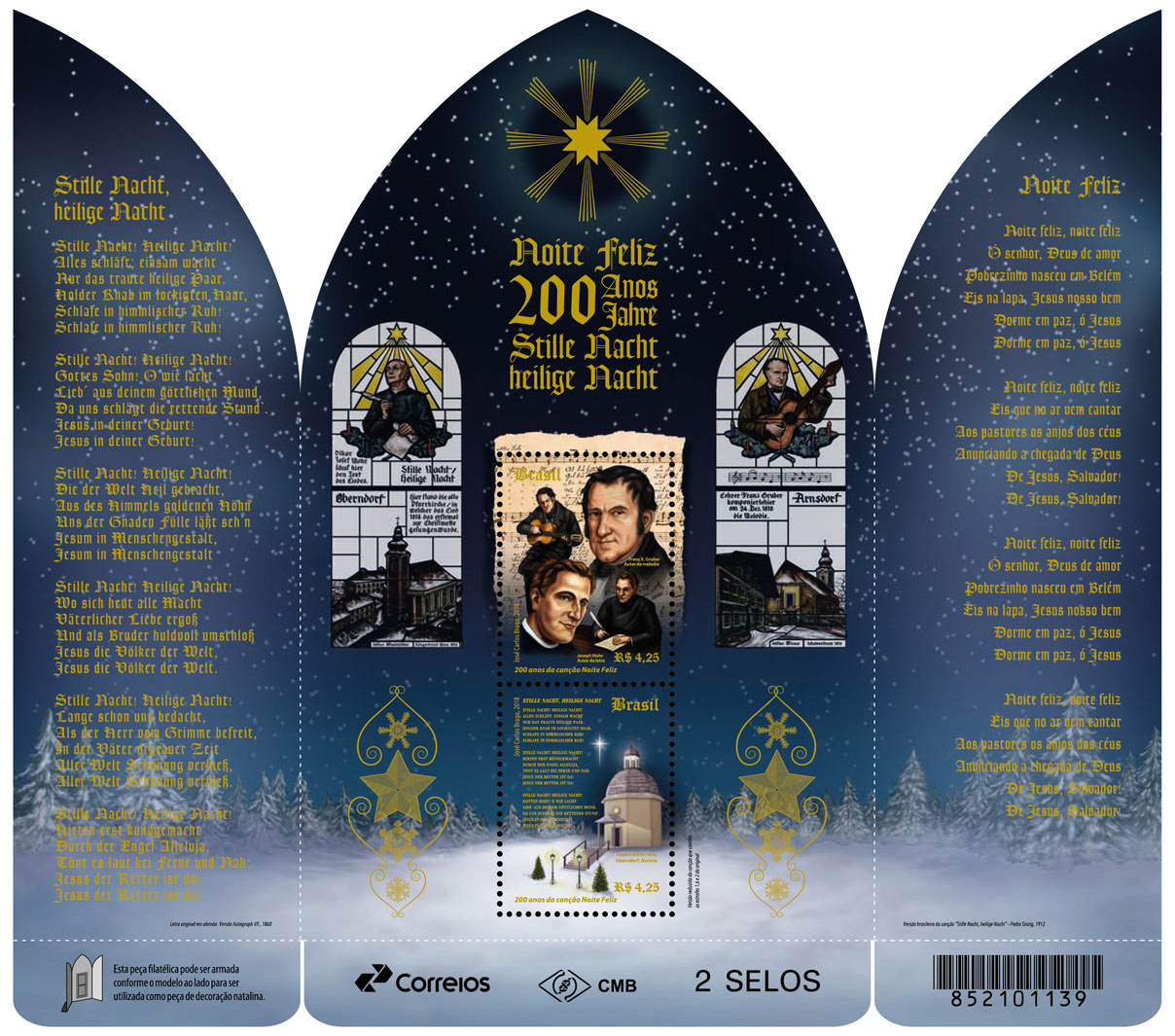 A forma di trittico, con i due pannelli laterali racchiudibili, l’emissione del Brasile firmata da Josè Carlos Braga offre la lettura sudamericana di un evento natalizio legato al villaggio di Oberndorf, in Austria, e più ancora a quella che forse è la più celebre melodia natalizia: “Stille Nacht”, che nel 1937 il sacerdote bergamasco Angelo Meli tradusse, aggiungendovi più di qualcosa di suo, in “Astro del ciel”. Ricco di testi e di illustrazioni, solo due delle quali trasformate in francobolli, lo spettacolare foglietto costituisce un compendio perfetto della celeberrima canzone natalizia. Lo fa attraverso il primo dei due francobolli da 4,25 reis sul quale è raffigurata la cappella di Oberndorf costruita tra il 1930 ed il 1936 sui resti della parrocchiale di St. Nikolaus nella quale nel 1818 per la prima volte avevano risuonato le note di “Stille Nacht”, e le tre strofe iniziali della stessa melodia. Il secondo valore, che presenta il medesimo nominale da 4,25 reis, propone, su uno sfondo costituito dal testo scritto e musicato di “Stille Nacht”, il doppio ritratto (giovanile in un caso, più maturo nell’altro) degli autori: il sacerdote Joseph Mohr (1792-1848) che nel 1816 compose i testi di quella che è considerata una “poesia per la pace”, e di Franz Gruber (1787-1863), l’organista che la musicò. I due ritratti sono ripetuti attraverso vetrate e vedute della chiese parrocchiali di San Nikolaus ad Oberndorf e di Arnsdorf. Nella prima, più volte danneggiata dalle inondazioni e altrettante ricostruita, fintando che nel 1906 venne abbattuta, esercitò il suo ministero pastorale il sacerdote Joseph Mohr, nella seconda Franz Gruber fu organista. Le due ante che completano il foglietto-trittico contengono, in caratteri gotici, il testo in lingua originale a sinistra e in portoghese a destra, di “Stille Nach! Heilige Nacht!”, nel corso degli anni tradotto in trecento e più lingue.