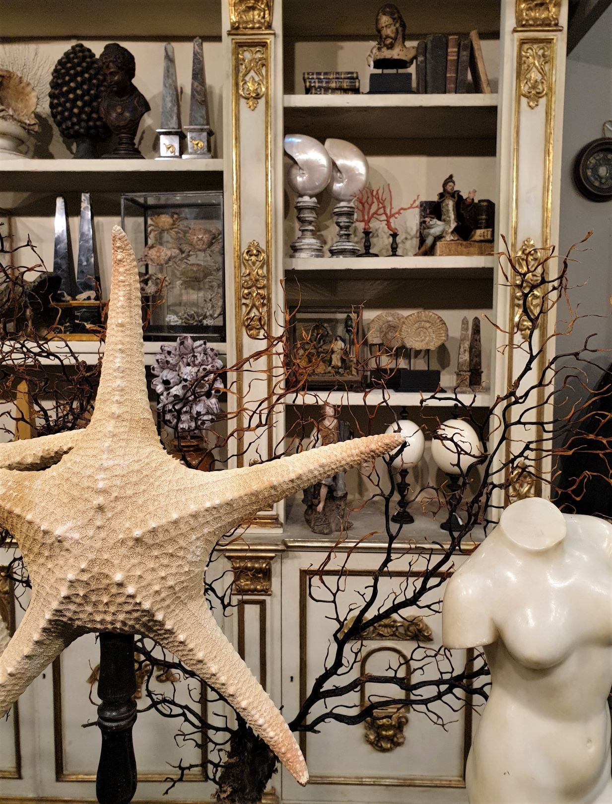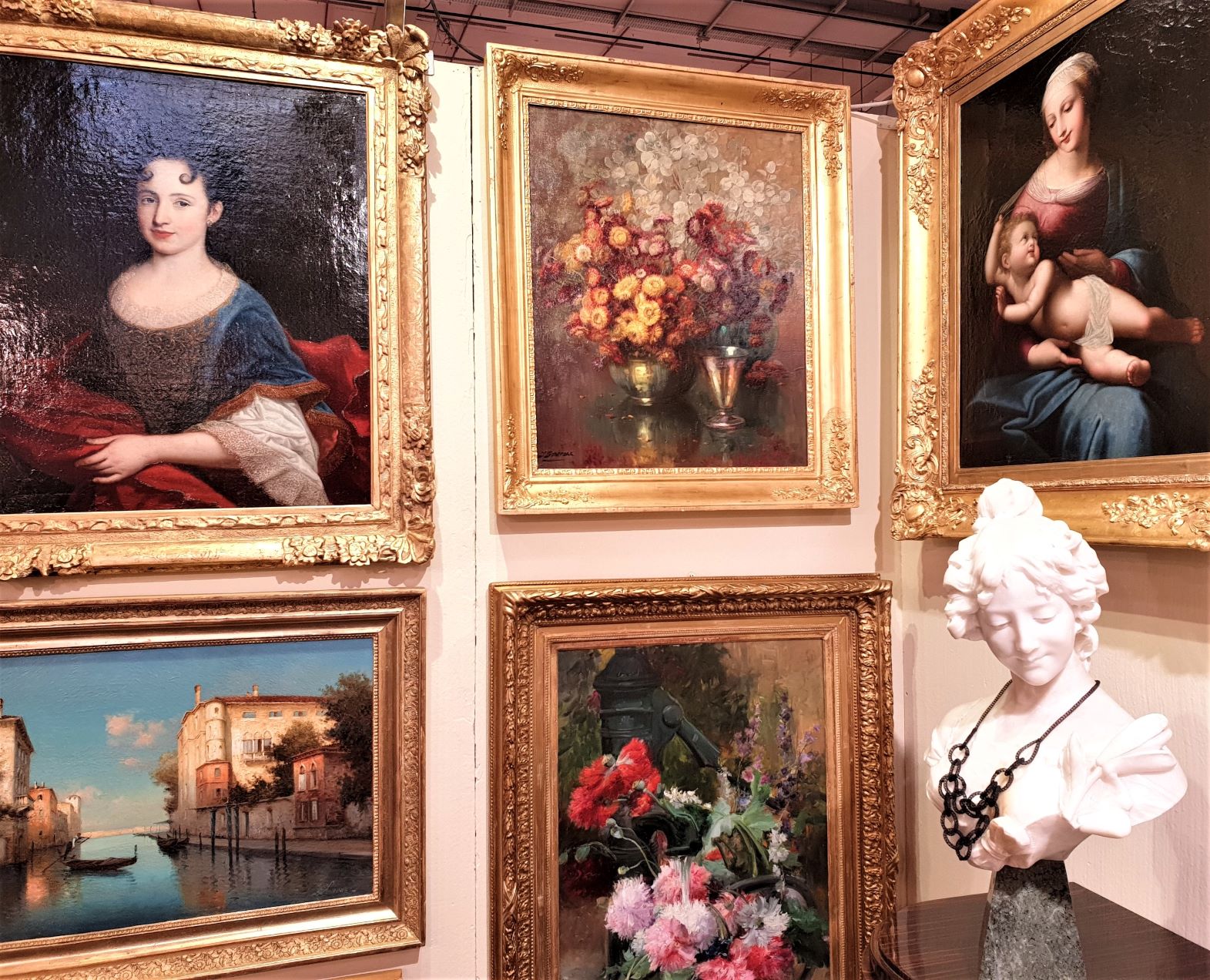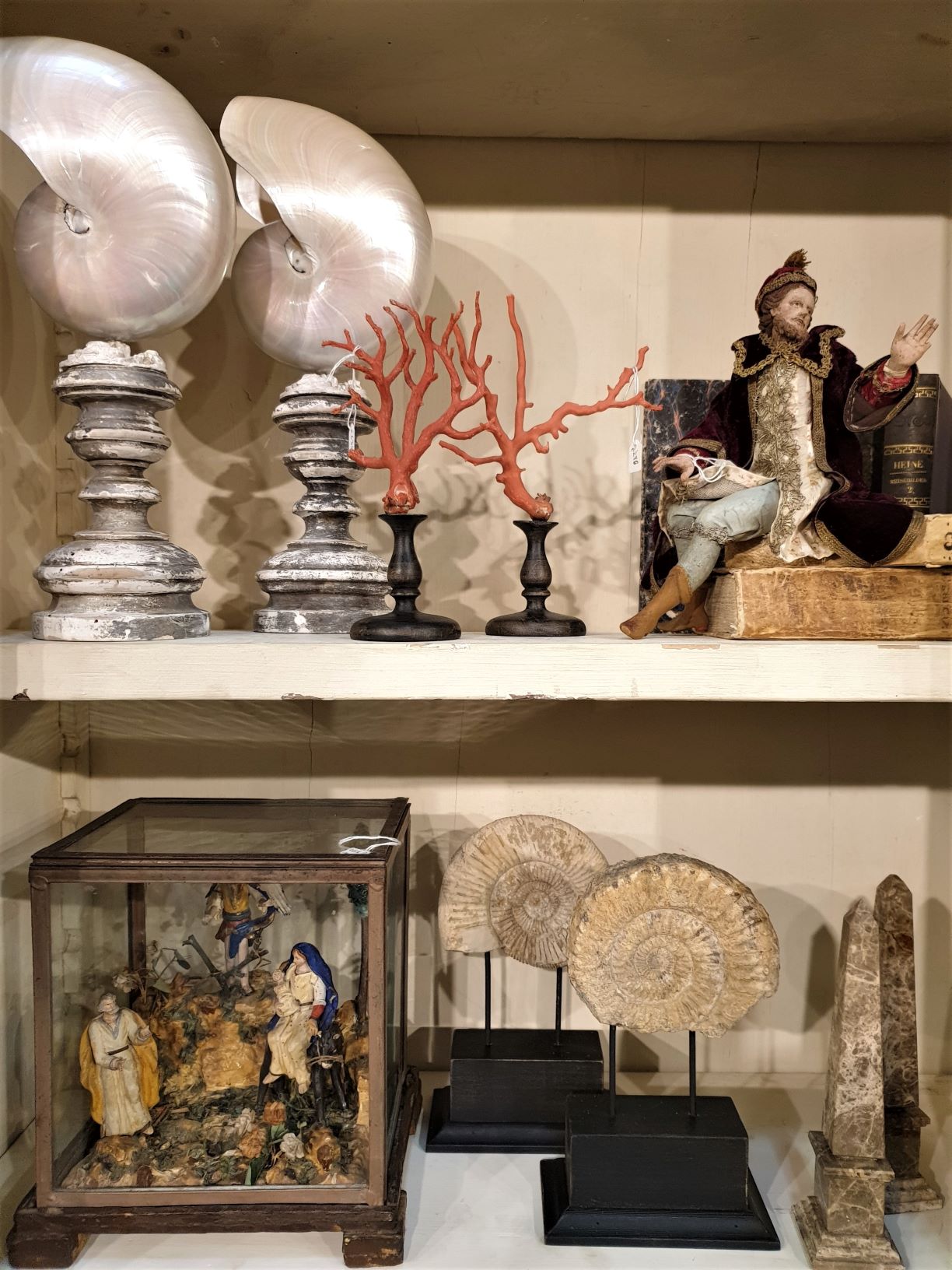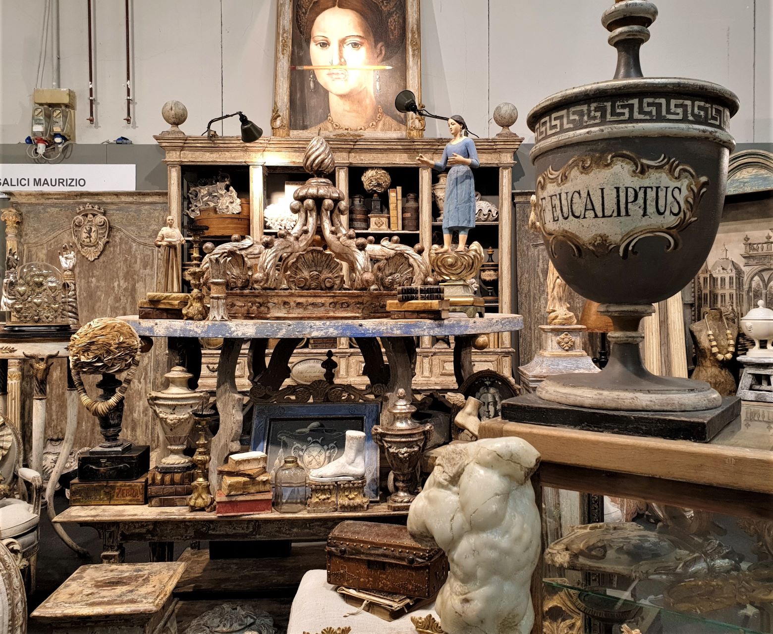 Coerenza, raffinatezza, gradazione cromatica: lo stand Antichità di Maurizio Salici è tra i più curati di tutta la manifestazione. Una composizione di decadente eleganza popolata di cornici, conchiglie, fregi, madonne, busti e coralli (e non solo)