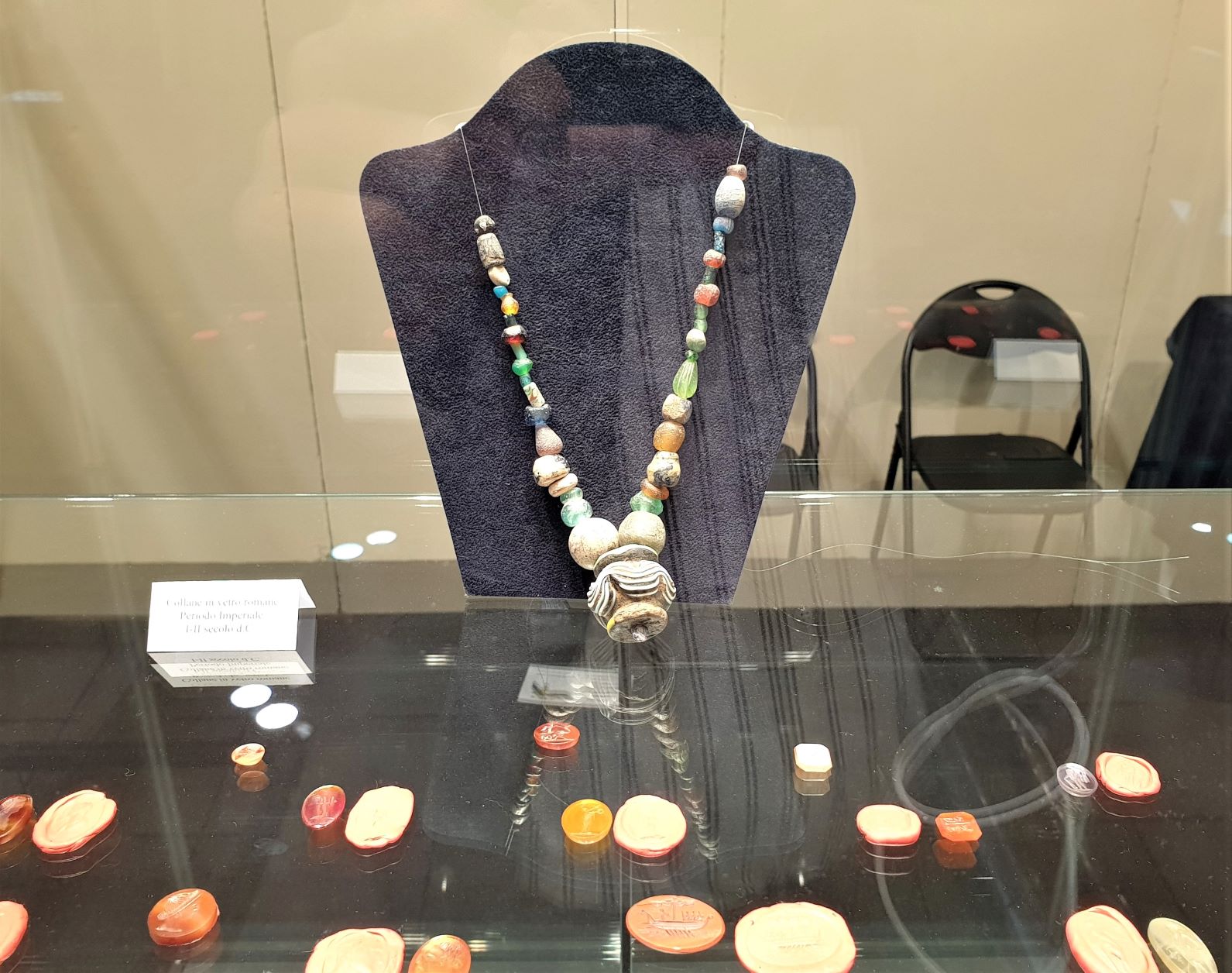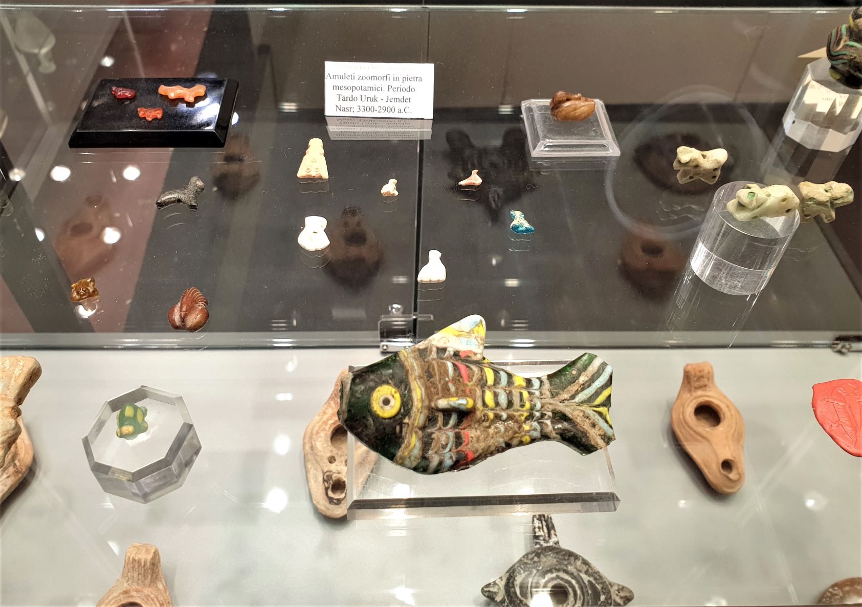 Chicche archeologiche. Amuleti zoomorfi mesopotamici in pietra + Statuetta lignea raffigurante il Dio Anubi + Collane in oro e lapislazzuli di età romana (Mutina Ars Antiqua)