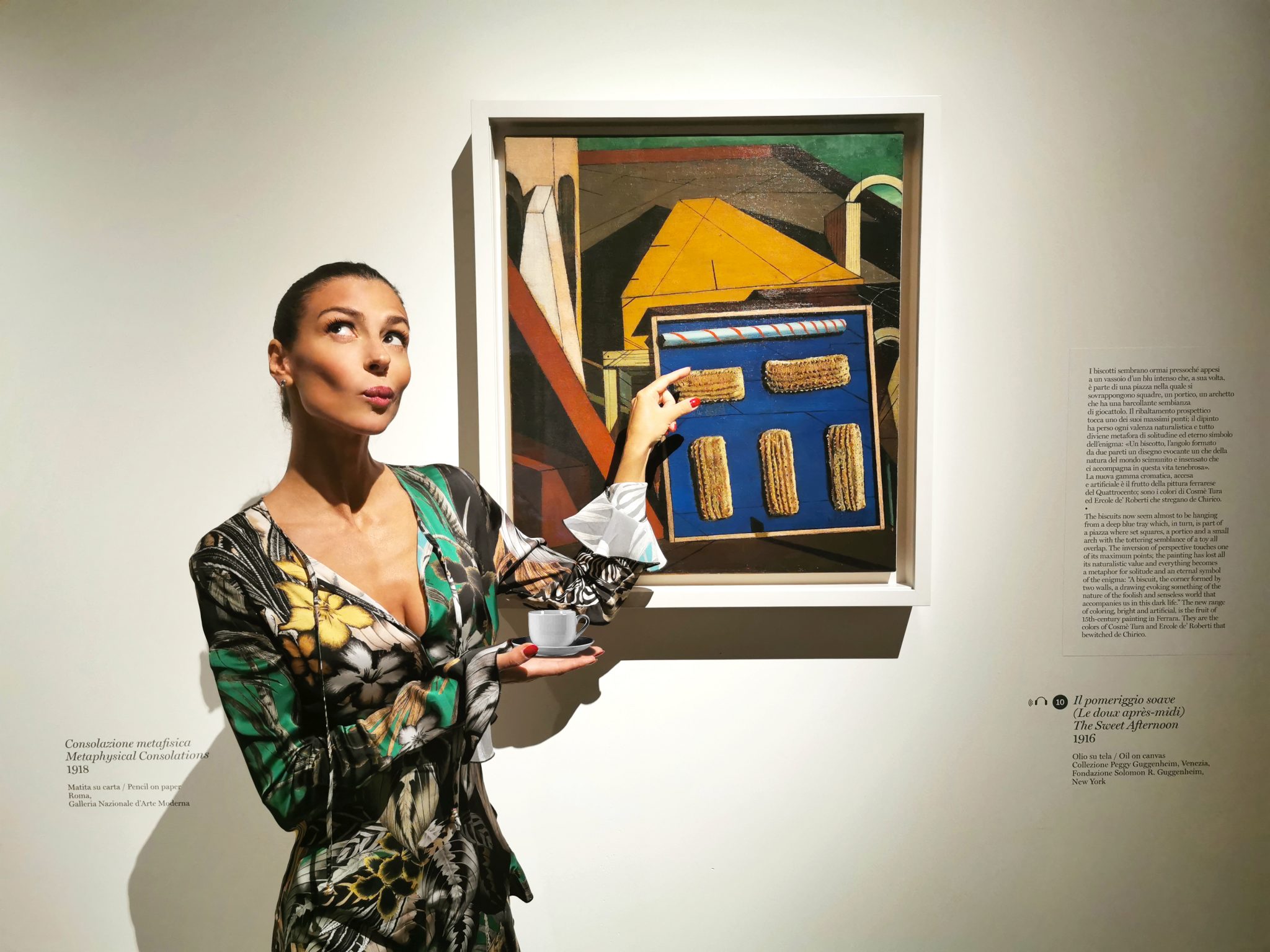 Un percorso espositivo fatto di confronti inediti che svelano il fantasmico mondo di una delle più complesse figure artistiche del XX secolo. L’esposizione offre la chiave d’accesso a una pittura ermeticache affonda le sue radici nella Grecia dell’infanzia, matura nella Parigi delle avanguardie, dà vita alla Metafisica che strega i surrealisti e conquista Andy Warhol e, infine, getta scompiglio con le sue irriverenti quanto ironiche rivisitazioni del Barocco.