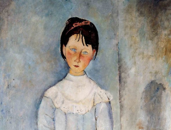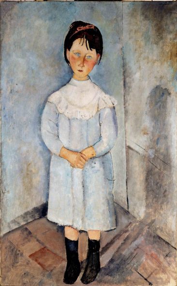 Tra le grandi opere in mostra il ritratto Fillette en Bleu del 1918, opera di grandi dimensioni che raffigura una bambina di circa 8-10 anni il cui vestitino e il muro retrostante sono dipinti di un delicato colore azzurro, in un ambiente ricolmo di dolcezza e innocenza; Il ritratto di Chaïm Soutine del 1916, suo caro amico durante gli anni parigini più difficili, seduto con le mani appoggiate sulle ginocchia; il ritratto Elvire au col blanc (Elvire à la collerette) dipinto tra il ’18 e il ’19 raffigurante la giovane Elvira, ritratta da Modigliani ben quattro volte, due da vestita e due nuda, conosciuta ed ammirata a Parigi per la sua folgorante bellezza; il ritratto Jeune fille rousse (Jeanne Hébuterne) del 1919, che ritrae la bella Jeanne Hébuterne di tre quarti mentre si rivolge allo spettatore in un atteggiamento pieno di naturalezza ed eleganza e capace di catture l’attenzione con suoi profondi occhi azzurri.