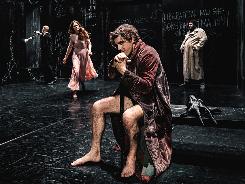 Pregevole anche il lavoro di Marta Crisolini Malatesta su scenografia e costumi. La scenografia nera di ardesia composta solamente da tre pareti conferisce al palco un carattere compatto. Le scritte bianche di gesso (frenetiche, ma funzionali) si sposano molto bene col minimalismo dello spazio definito dalle pareti nere donandogli eccentricità. Uno spazio in generale che si dimostra coerente con ognuna delle scene rappresentate. Così come la scelta costumi, una selezione ben ragionata, soprattutto nel momento dei nudi di Margherita e Natasha che rimangono parziali, qui Crisolini Malatesta va sinceramente ringraziata per aver risparmiato agli spettatori il triste spettacolo del nudo totale (ormai privo del significato sovversivo che ha avuto nel teatro post-moderno), che viene oggi, senza tregua, riproposto almeno due o tre volte a stagione in ogni teatro. Straordinario anche il supporto dato dalle musiche di Giacomo Vezzani alla narrazione. Caratterizzate da bassi profondi e sonorità oscure, le musiche servono perfettamente gli scopi della trama, sottolineando in modo preciso e corretto i climax ascendenti di tensione narrativa.