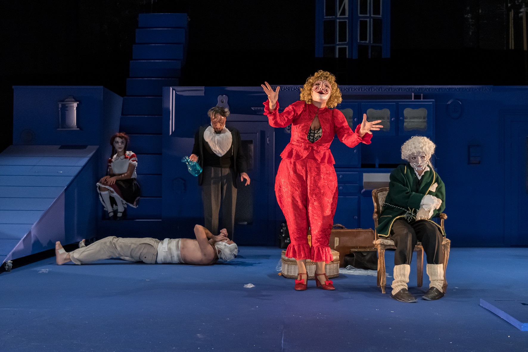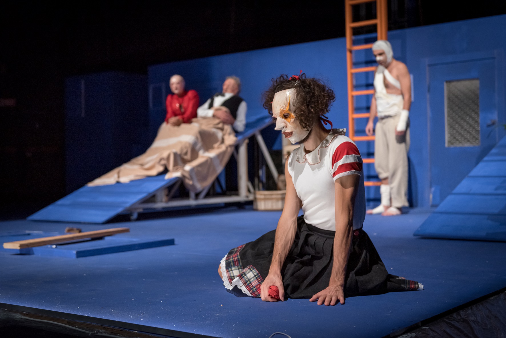 Gli attori della compagnia, capitanati da Enrico Campanati, si muovono nell’assurdo a cominciare dal loro essere assoggettati da un rumore che sentono solo loro e che li ossessiona a tal punto da costringerli continuamente a cambiare casa, salendo sempre più in alto verso una vetta che non sarà mai il Paradiso,ma anzi li condurrà all’Inferno. Ma assurdo è anche il loro porsi, costretti dentro una maschera di gomma aderente al viso che ne deforma i lineamenti e costumi imbottiti di gommapiuma che rendendo difficilissimo il recitare. Ma anche questa scelta è stata pensata con cura: chi non cela dietro una maschera il suo vero essere? Chi non si riempie di orpelli per apparire diverso, e senza dubbio migliore, da quello che è in realtà?