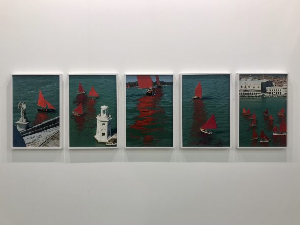 Mazzoleni sceglie di dedicare l’intero stand a Melissa McGill, che lo tinge ti rosso con le vele della sua Red Regatta, il progetto di arte pubblica realizzato a Venezia tra il maggio e il settembre passati. Fotografie, video e campionari di “rossi” ripercorrono le fasi di creazione di un lavoro dai molteplici rimandi, dai mattoni veneziani alla forza della passione, senza tralasciare i riferimenti ai maestri del tonalismo veneto come Tiziano e Tintoretto ma anche temi scottanti come il cambiamento climatico e il turismo di massa.