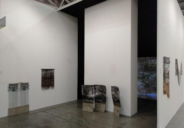 La francese Galerie Dix9 dedica l’intero stand a Leyla Cárdenas, stella nascente dell’arte colombina, che si fa portavoce dei cambiamenti del suo paese al di fuori dai confini nazionali. Le rovine architettoniche di Bogotà servono da incipit per un processo di decostruzione prima e ricostruzione poi, per salvare dall’oblio del tempo la storia e la memoria nazionale. Le grandi lamiere ricoperte di carta e i tessuti spioventi creano un’atmosfera immersiva in cui il visitatore può sperimentare la forza di fotografie che sembrano aver acquistato una terza dimensione.