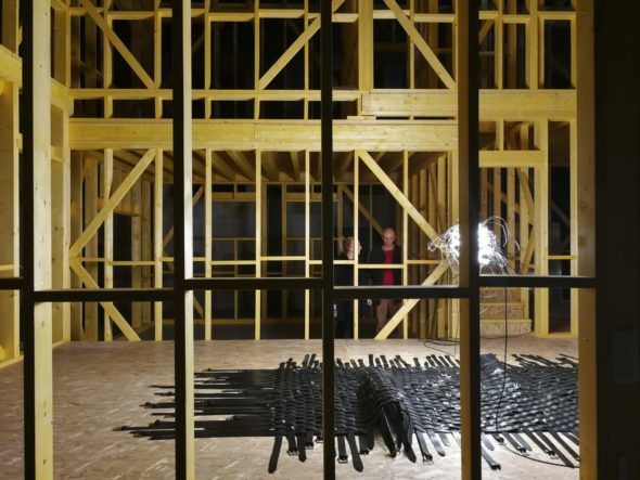 Ed è proprio quello che accade, subito dopo, quando vediamo riprodotto un grande telaio in legno che disegna nell’immenso spazio espositivo lo scheletro di una tipica bifamiliare italiana anni sessanta/settanta. Mancano i muri, manca divisone lì dove si desidera privacy. Ma quale universo si nasconde dietro le quattro mura di ogni casa? Parole, gesti e segreti sconosciuti a noi e sconosciuti, qualche volta, anche agli inquilini stessi. Ciò che è inteso per isolare è, nella serialità, in continua condivisione con le abitazioni vicine; allo stesso tempo però la casa è anche pensata per raccogliere e unire al suo interno, ma spesso contribuisce invece ad allontanare. Tanto che alla bifamiliare in mostra manca una delle due case: è tronca, manchevole, forse in costruzione. Forse come il vuoto dei suoi abitanti, forse come il vuoto dei suoi visitatori.
