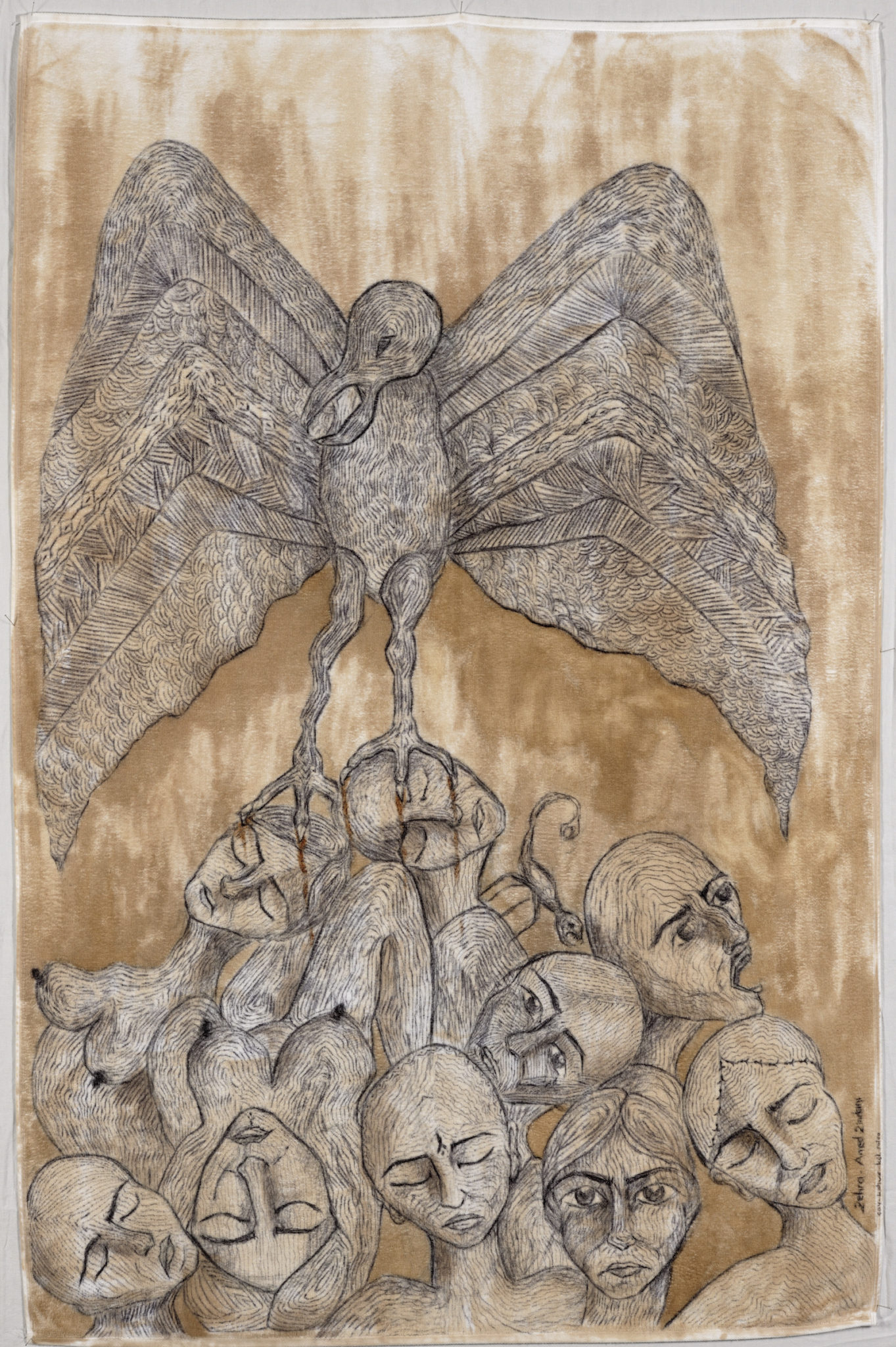 Nella successiva e ultima sezione, oltre ai numerosi simboli – soprattutto animaleschi – anche episodi dallo sfondo sociale e politico. Afrin (2018) è un riferimento diretto alla città siriana a maggioranza curda, obiettivo dell’operazione “Ramoscello d’ulivo” nel 2018. Un massacro contemporaneo che Zehra decide di raccontare attraverso il filtro della resistenza cittadina, animata dalla volontà di creare una regione libera e autonoma. Nonostante il dipinto ritragga un episodio storico preciso, i rimandi spazio-temporali sono innumerevoli; il direttore sottolinea ad esempio un parallelo sorprendente con i Profughi di Francesco Hayez (1831), quadro facente parte della collezione del Museo di Santa Giulia. L’ultima opera esposta è una camicia incorniciata sulla cui stoffa le compagne detenute hanno inciso i propri pensieri. Non è un feticcio, né un canto vittimista, infatti per l’artista “lavorare con le donne del carcere è stato un lusso, un’occasione di formazione personale e la possibilità di costruire una serie di attività collettive di resistenza”.