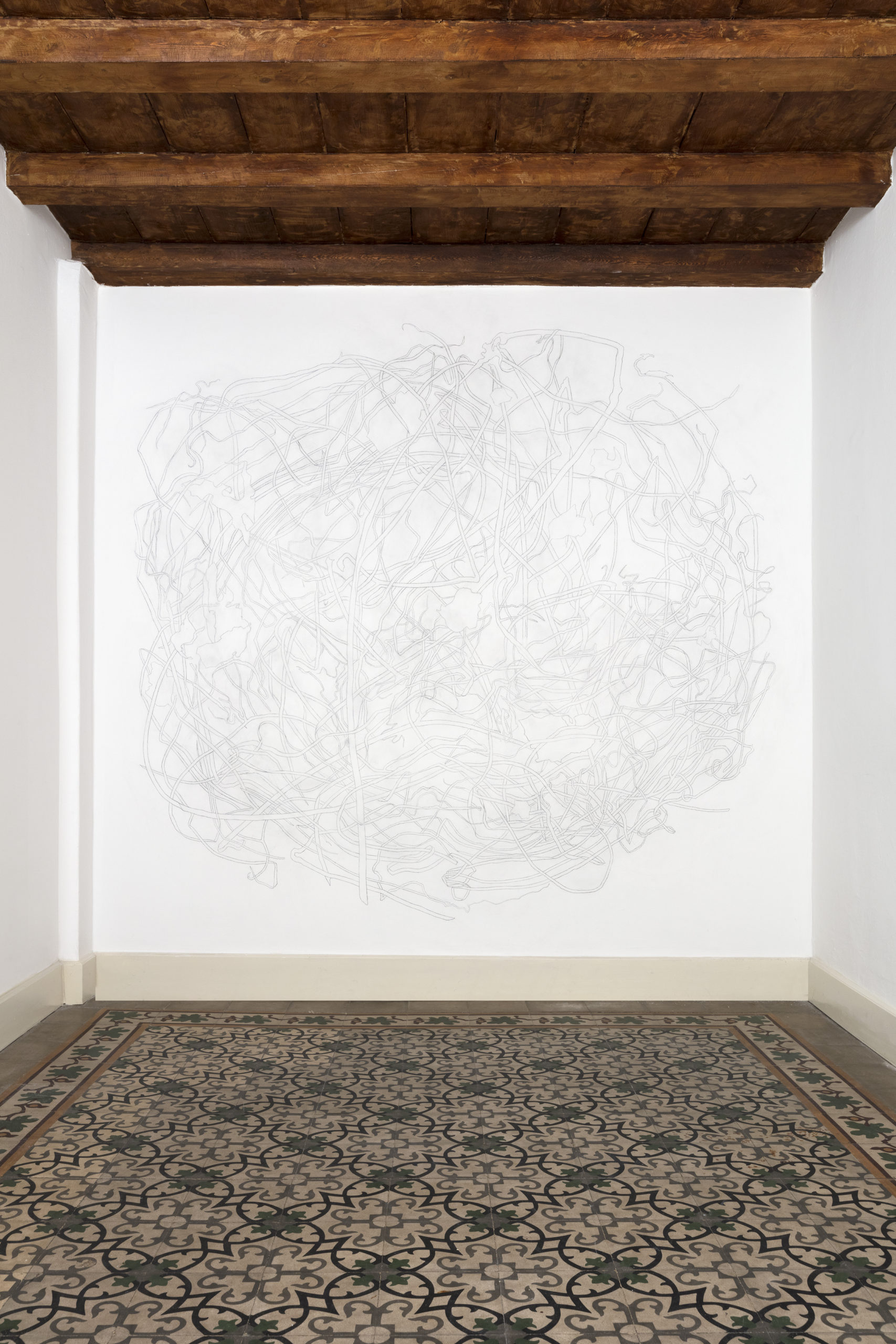 Tutto è nato dall’osservazione del pavimento del Bongiovanni: grovigli sintetici che si ripetono a moduli, dalle forme molto geometriche ma che rimandano anche a intrecci di rami. Ho pensato subito che quella piccola stanza fosse una tana in cui avrei voluto vivere, e di fatto è stato così perché ho partecipato a una sorta di residenza che ha visto l’impiego di oltre sessanta ore di disegno su muro.