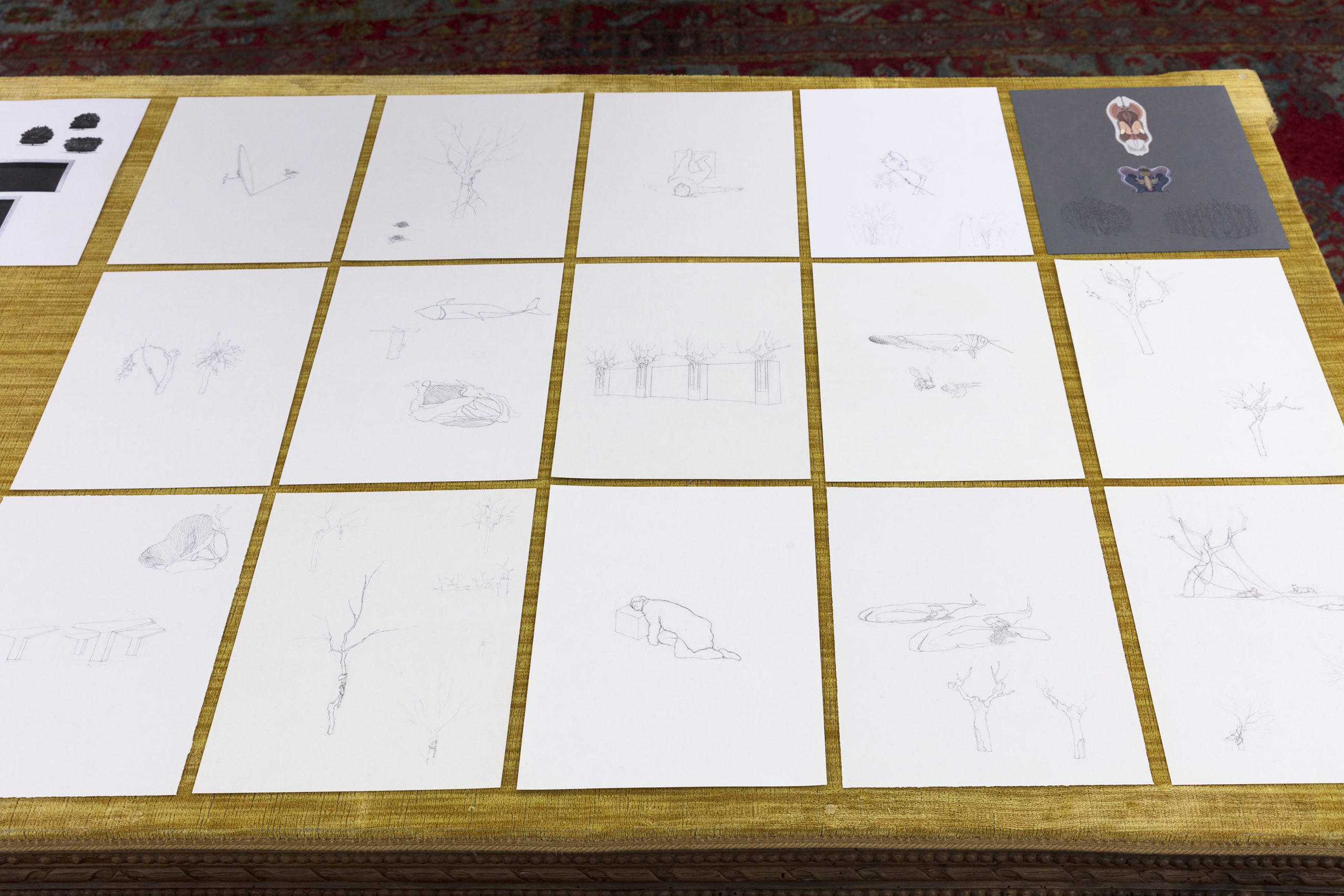Nella prima sala ad accogliere lo spettatore sono diversi incastri di flora e fauna, tra cui un groviglio di serpenti (Abbracci, 2019), abbozzati con delicatezza su carta. Questi rettili assumono la stessa conformazione intrecciata sia nell’accoppiamento che nella lotta. Eros e Thanatos, uno storico rapporto che risuona negli spazi della Fondazione, infestati dall’effimera presenza umana e addolciti dal continuo richiamo alla natura.