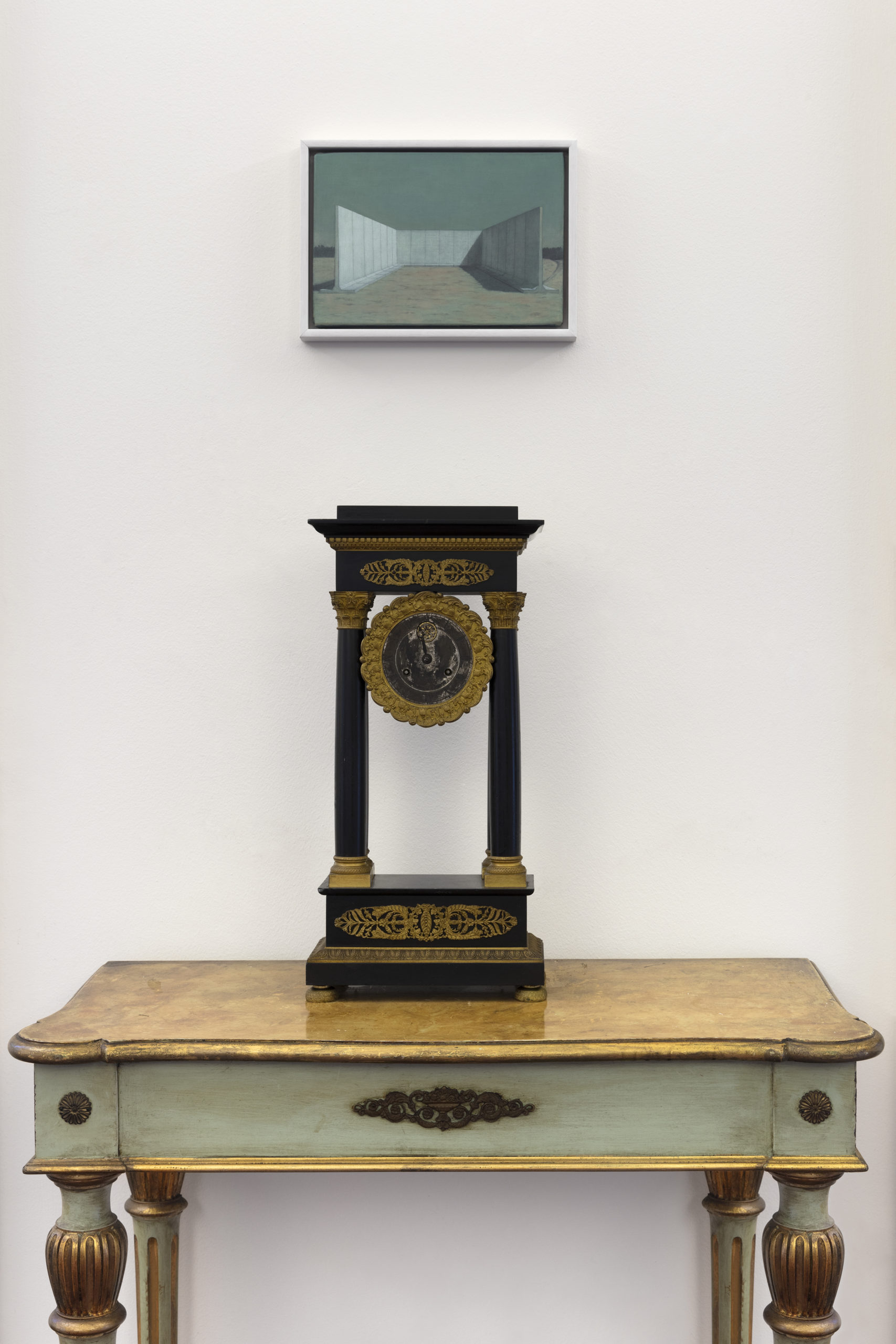 Nella seconda sala una teca con alcuni disegni in grafite, che riflettono su come le strutture di potere soffochino e plasmino l’essere umano, nodi burocratici kafkiani sotto forma di architetture opprimenti e organi sessuali distorti. Continuando il percorso espositivo incontriamo tre opere pittoriche dai colori tenui, che sono state affisse a muro per originare, senza forzatura, un dialogo genuino con i quadri di Bongiovanni Radice.