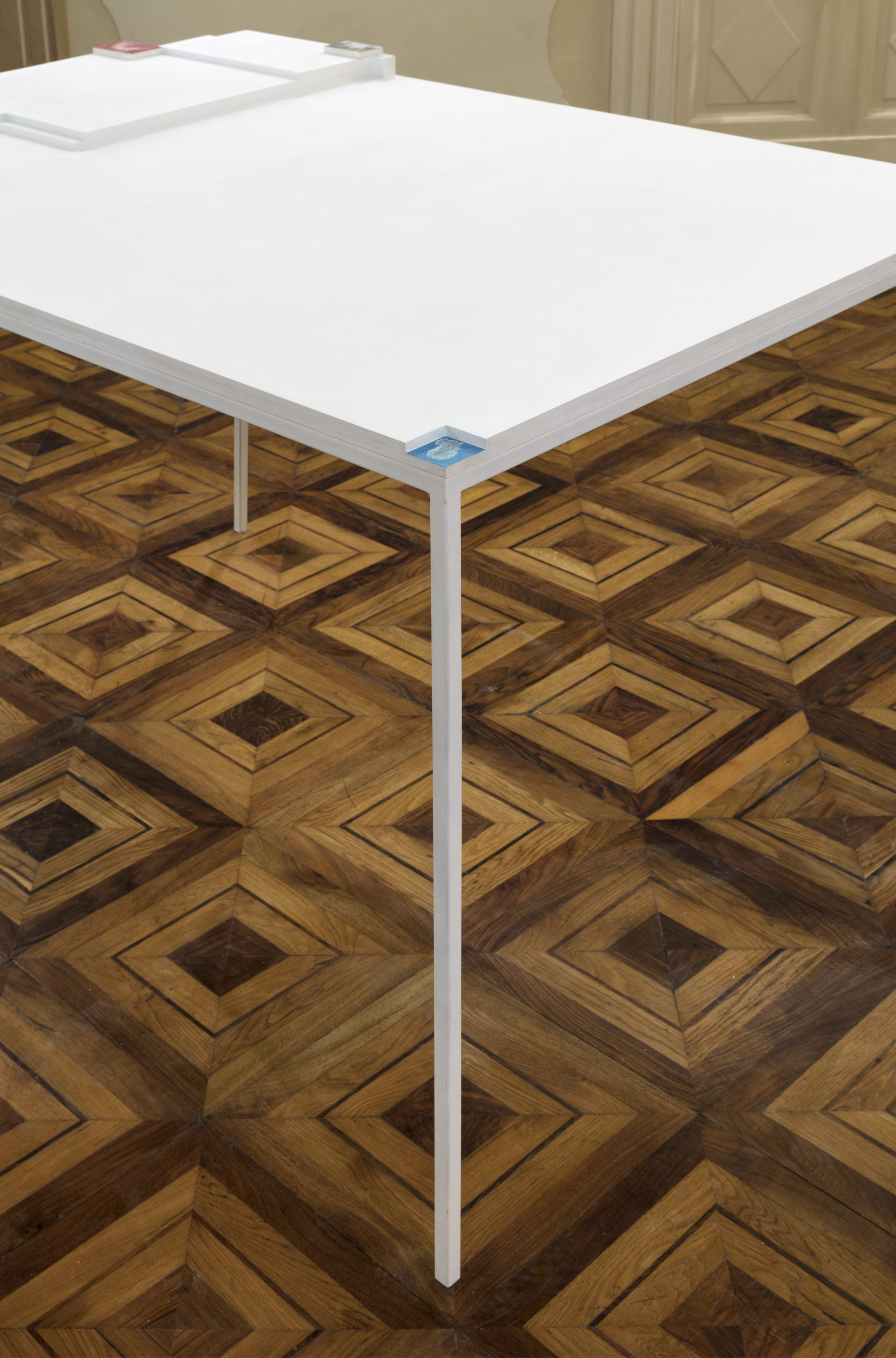 Nella sala successiva, quella più maestosa, una coppia di display biancastri, realizzati ad hoc per la mostra, supportano interventi infinitesimali a metà tra pittura e scultura, tessere indipendenti che assumono nuovi significati se letti come un unico puzzle. Uno di questi due riflette sull’alimentazione come ciclo naturale e dichiara l’insignificante posizione dell’uomo, stilizzato e marchiato da una X rossa come in un segnale stradale. Il secondo prova a raccontare la storia di un piccolo uomo che tenta il suicidio, ma si ritrova a volare nel cielo, per ribadire la mancanza di libero arbitrio.