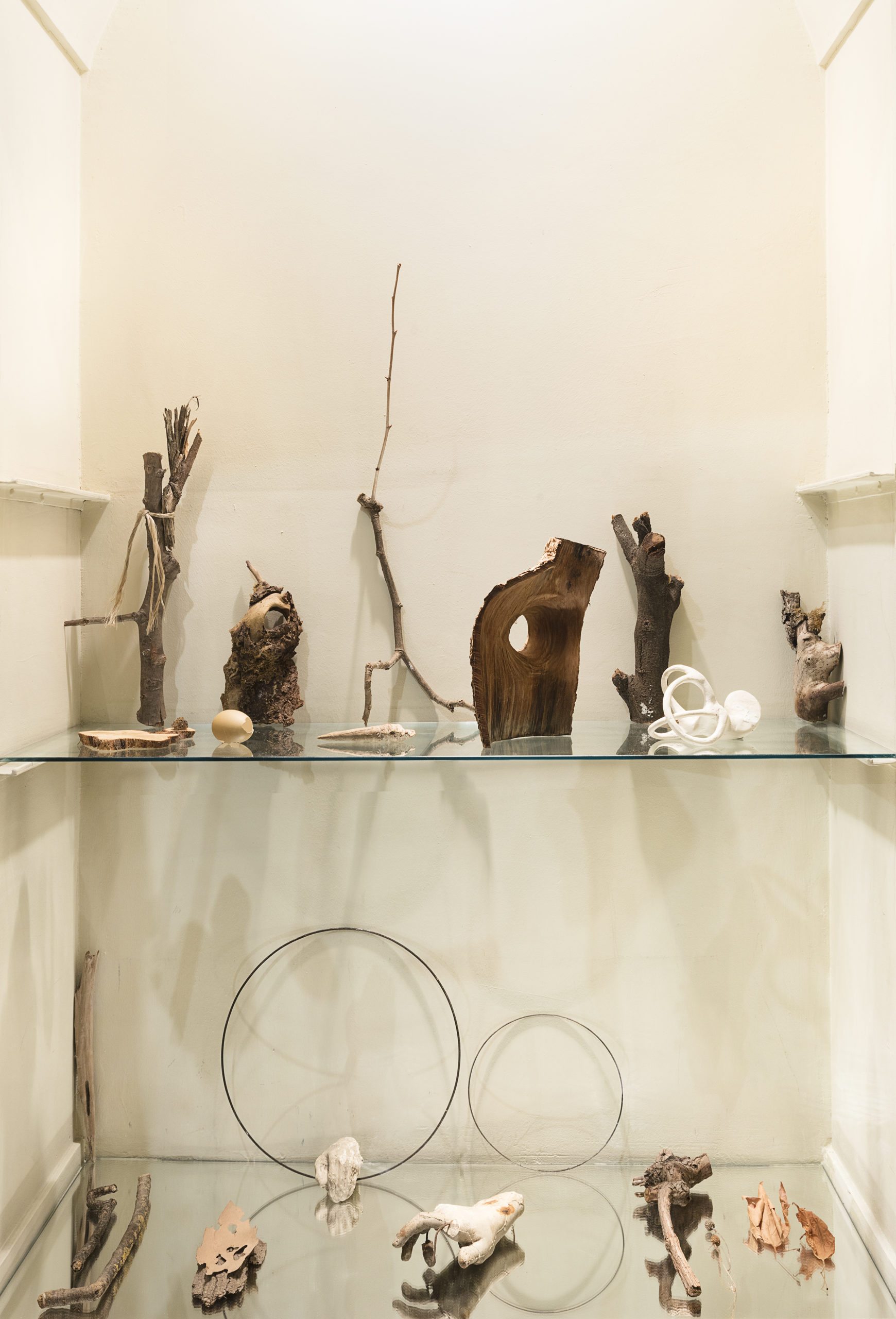 Questo murales labirintico, ci svela la Daneri, cerca di ingrandire un groviglio di erba che in una giornata di cammino si è depositato per caso sul corpo dell’artista. Un ramo spezzato, una foglia rinsecchita e dell’erba calpestata non sono dati per scontato, ma anzi recuperati dall’artista e riassemblati con e attraverso altri medium. Così nella sala principale arti in gesso, foglie, muschi e cortecce sono esposti nelle teche, senza apparire dei feticci ma solo assemblage precari destinate a dissolversi dopo la mostra.