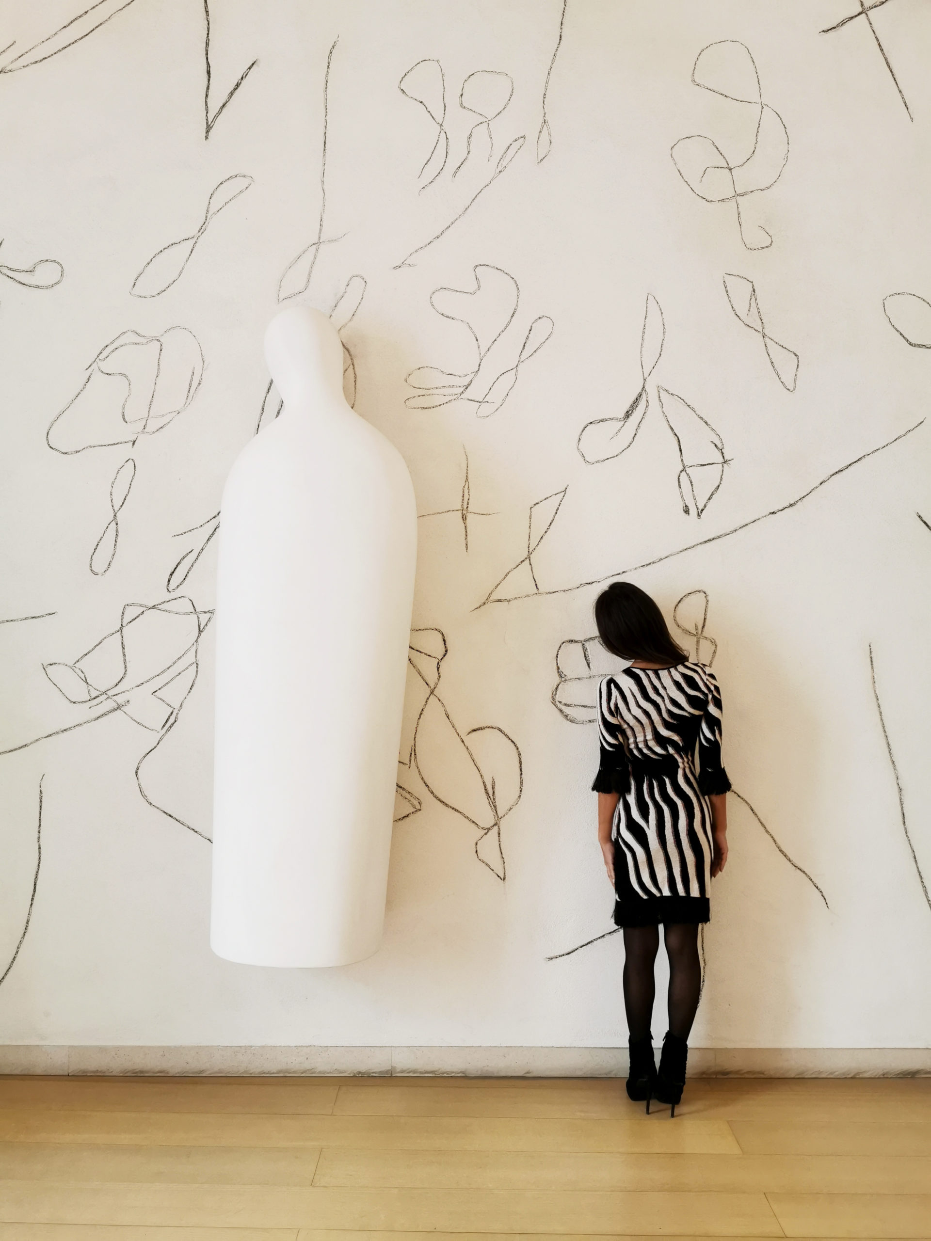 Dal 1985 il dialogo tra pittura e scultura per Paladino si fa più serrato e le installazioni di grandi dimensioni si basano sempre più sulle combinazioni di elementi scultorei figurativi con scansioni pittoriche monocromatiche. Nella sala a lui dedicata al Madre l’insieme formato dagli ermetici segni graffiati sulla superficie grezza delle pareti e la scultura aggettante nello spazio assumono un rilievo ambientale che immerge lo spettatore in una totalità epifanica.