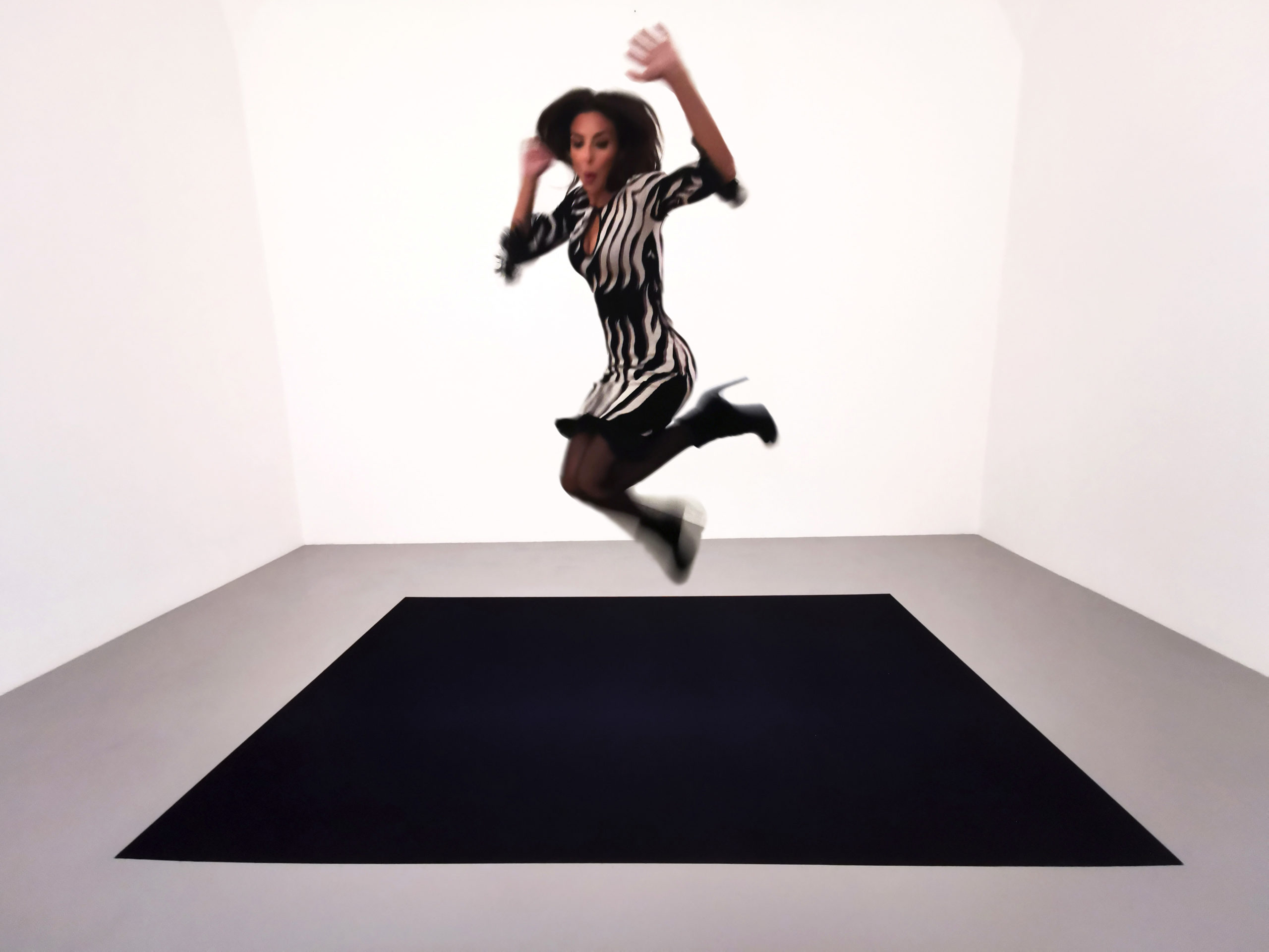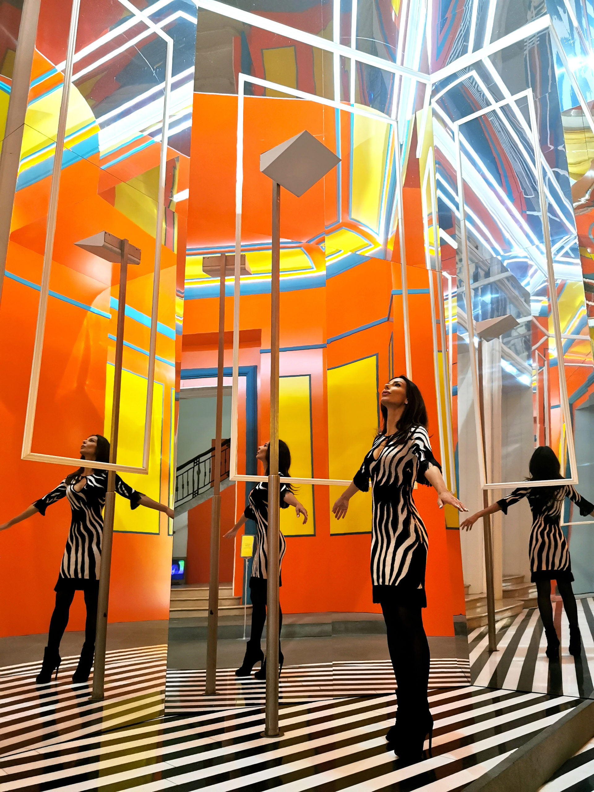 Il lavoro dell’artista è costituito da un intervento di dimensioni architettoniche, concepito appositamente per l’atrio del museo. Affacciato in modo obliquo rispetto alla via antistante, l’edificio del museo viene fatto “ruotare” dall’intervento artistico per rimettersi in asse verso l’antistante Via Settembrini: attraverso strisce di marmo bianche e nere di 8,7 cm (una delle caratteristiche ricorrenti degli interventi in situ dell’artista) il pavimento dell’ingresso suggerisce un’inedita via di fuga e un potenziale asse prospettico rettilinei all’asse stradale, facendo in modo che il museo esca da se stesso per abbracciare la città intorno, mentre una struttura-padiglione, composta da superfici colorate e di specchi, riverbera ed esalta questa assonometria immaginaria. Così l’artista agisce sul punto di vista dello spettatore, creando uno spazio di mobilità percettiva, di visione, mediazione, attrazione e comunione reciproche, in cui interno ed esterno, museo e comunità si compenetrano l’uno nell’altro. Ogni visitatore è accolto e invitato, letteralmente a colpo d’occhio, a far parte dell’opera, a partecipare alla relazione che essa celebra fra la sfera istituzionale e le dinamiche pubbliche.