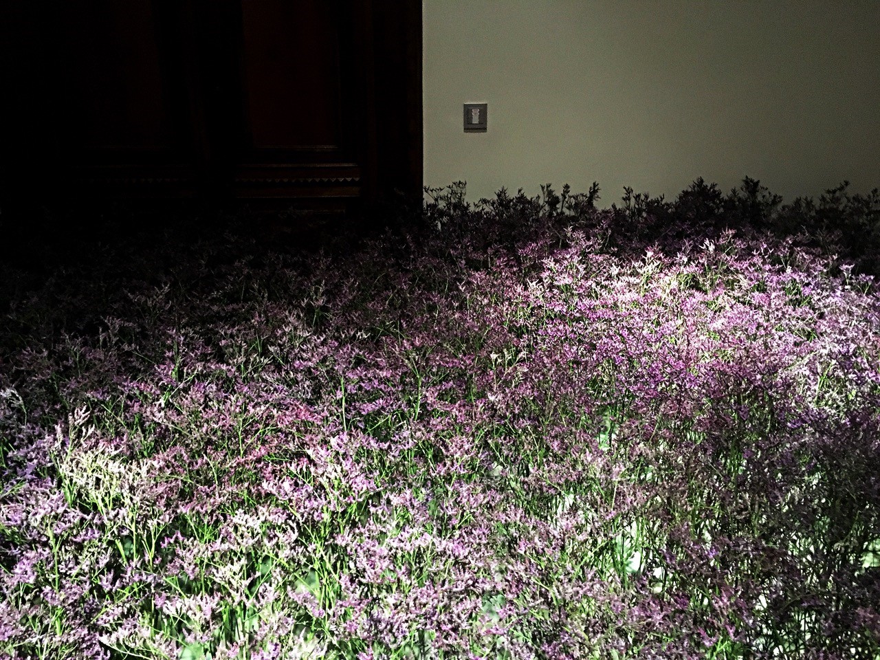 Ci sono zone lagunari che periodicamente vengono sommerse, sempre più spesso e in maniera sempre più violenta (basti pensare all’ultima alluvione che a novembre ha colpito il veneziano) ma alcune rimangono all’asciutto per un tempo abbastanza prolungato in modo da permettere la crescita e la fioritura di una pianta autoctona chiamata Limonium, una pianta erbacea perenne caratterizzata da piccoli fiori rosa e viola. Questa pianta, che non cresce isolata, crea visivamente delle vere e proprie nuvole galleggianti sull’acqua. L’artista in una stanza della mostra vuole ricreare questo paesaggio: la pianta che si può osservare nella sala è reale ma allo stesso tempo de-localizzata, posta su spugne risulta un fake: le piante osservabili in mostra non sono state prese dal territorio lagunare ma vengono dal Kenya, quindi non sono quelle “originali”.