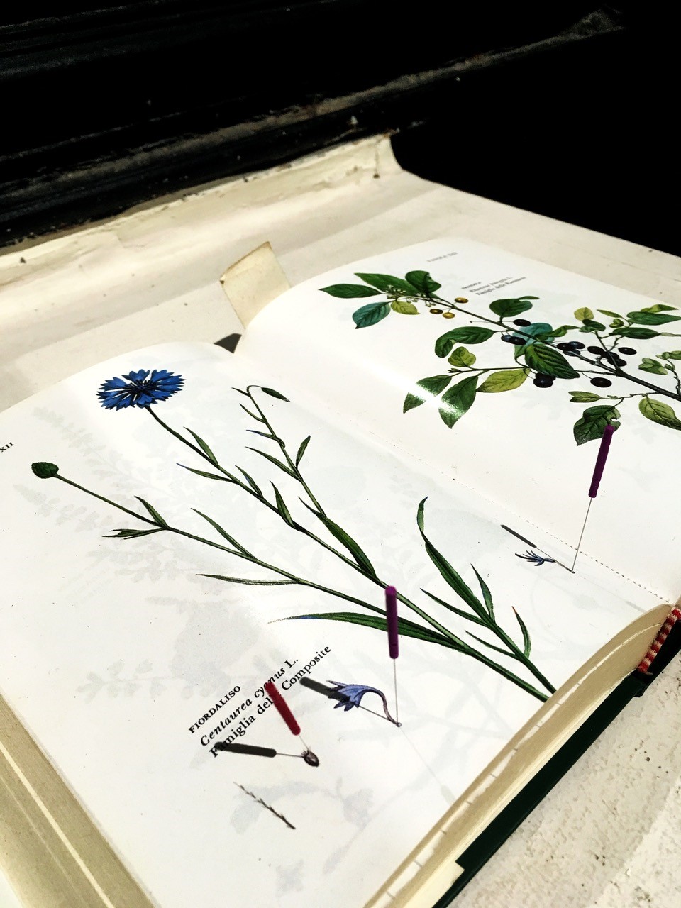 La ricerca di Giovanna Repetto parte quindi dall’analisi di queste contraddizioni, evocando nelle sue opere paesaggi viventi ma morti. Nella prima sala del percorso espositivo si incontra un video che pone l’accento sulla folle tecnologia utilizzata per mantenere a tutti i costi in vita organismi ormai morti, come le piante sradicate dal loro terreno e portate allo stremo per essere belle e profumate in modo da poter essere esposte negli hotel e fare “bella figura”. La ricerca artistica di Giovanna fa parte di un processo di tamponamento, seppur senza cura, di queste specie floreali attraverso la prativa dell’agopuntura. L’agopuntura è una attività che viene attuata sull’uomo per creare una percezione di benessere mentale e fisico e permettere che la connessione tra flussi energetici non si interrompa. Tale pratica è una medicina alternativa di origine cinese che nasce dall’idea che il corpo sia attraversato da flussi energetici e quando quest’ultimi si interrompono percepiamo dolore fisico. Attraverso l’ago questo flusso si sblocca.