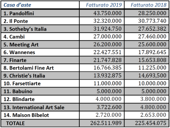 Come lo scorso anno le due maison che si sono conteste i primi posti sono state la milanese Il Ponte e la fiorentina Pandolfini. Quest’ultima, al primo posto, ha chiuso l’anno con quasi 44 milioni di euro realizzando uno dei migliori risultati mai ottenuti in Italia da una casa d’aste nostrana.