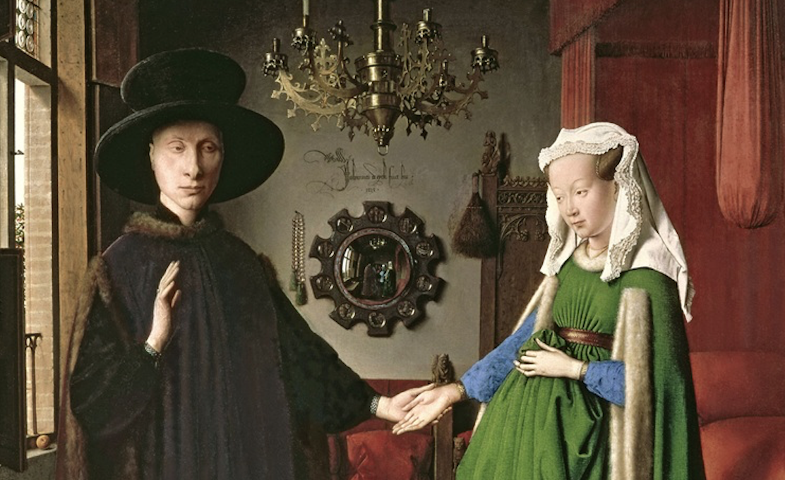 Innanzitutto “I coniugi Arnolfini” di Jan van Eyck, della National Gallery di Londra. Dipinto nel 1434, è uno dei primi e più antichi dipinti rinascimentali a rappresentare una coppia di sposi. Nonostante il titolo tradizionale, non è certo che le persone ritratte siano in realtà i signori Arnolfini. Lasciando da parte l’enigma della loro identità, quest’uomo diffidente e sua moglie dalla pelle di porcellana furono sicuramente apprezzati da Van Eyck. Il ritratto mostra la coppia che si tiene per mano a casa dopo il matrimonio, piuttosto che in chiesa facendo i voti. Tuttavia è pesantemente carico di dettagli simbolici come qualsiasi pala d’altare.