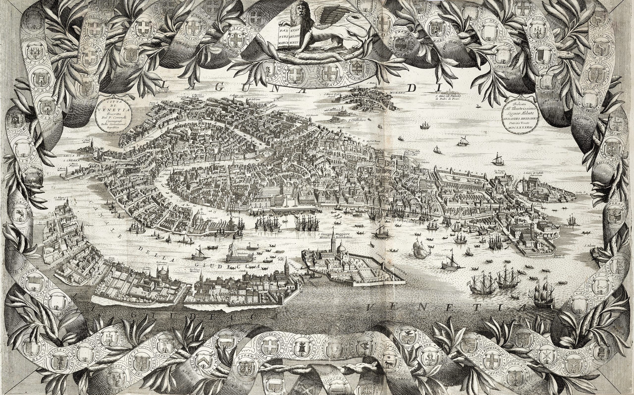 Passando alla fine del XVII secolo, ma rimandendo focalizzati sui volumi illustrati, da menzionare l’Atlante veneto: Corso Geografico Universale. Venezia 1691-92 di Vincenzo Coronelli, contenente 120 tavole della celebre raccolta dell’autore, con una splendida veduta di Venezia a volo d’uccello (stima € 5.000-8.000).