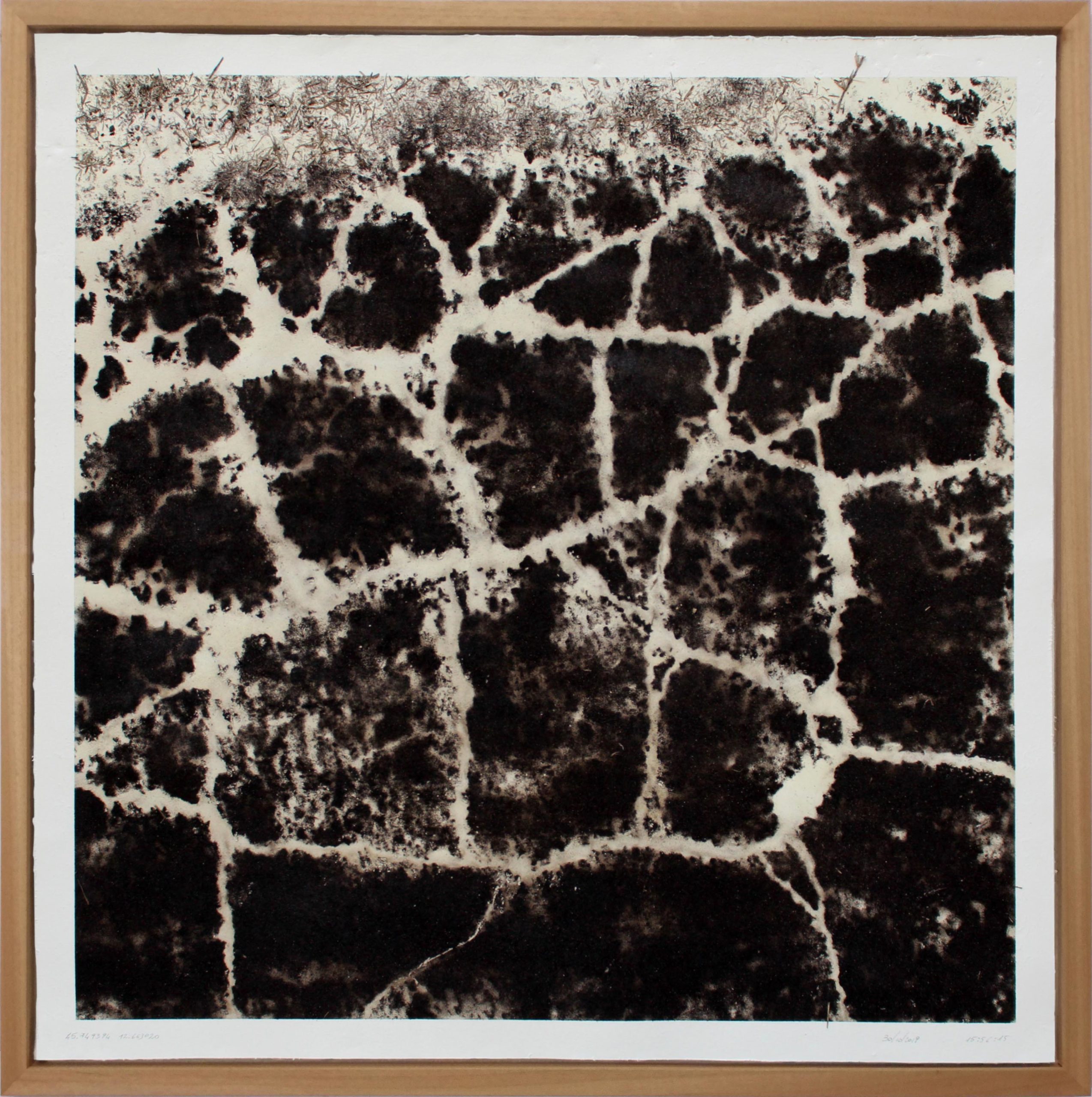 A questo poetico processo di ricerca segue una realizzazione tecnica molto precisa che ha come risultato finale delle opere quadrate con concrezioni terrose dove le parti “vuote” sono le immagini di crepe, fessure, aperture della superficie prescelta. Ogni lavoro ha per titolo data, ora e coordinate satellitari del luogo scelto come “scenario”. Il perpetuo divenire delle crepe, viene così congelato in un’istante creando un’opera unica e irripetibile (si vedano maggiori informazioni in allegato).
