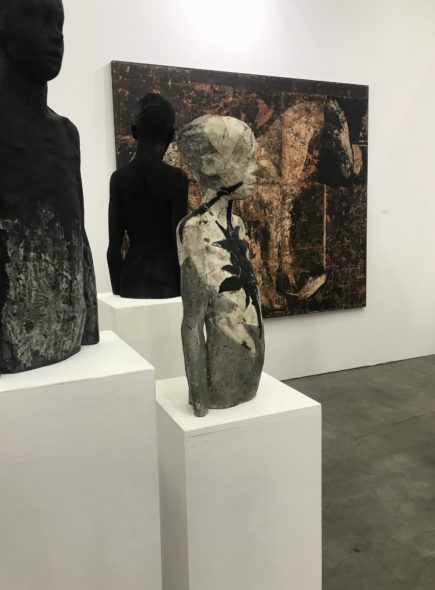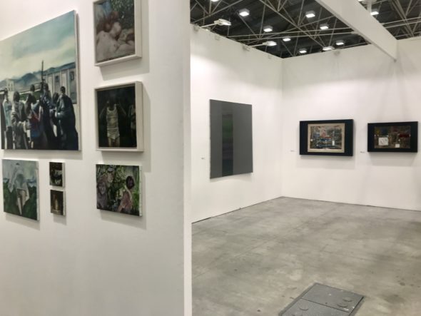 Stand dai toni sabbia quello della Galleria l’Ariete, dove Nicola Samorì si alterna a Jingge Dong e le figura intagliate di Paolo Migliazza vigilano sui passanti.
