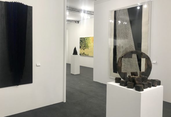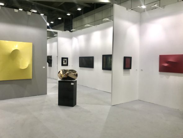 Tra le prime gallerie ad accogliere i visitatori in fiera, Mazzoleni come sempre mette in campo una selezione di artisti di elevata caratura, raccolti ne Il segno dell’artista. Bonalumi, Hartung, Reimondo, Francolino e Burri dialogano in uno stand curato con grande attenzione da Gaspare Luigi Marcone, a cui si aggiunge un ottimo Focus, curata da Laura Cherubini, che vede protagonisti Lucio Fontana e Gianfranco Zappettini, due artisti di generazioni differenti che hanno, in periodi e modalità diverse nel dopoguerra, indagato la superficie pittorica, ampliandone e ridefinendone i confini.