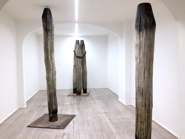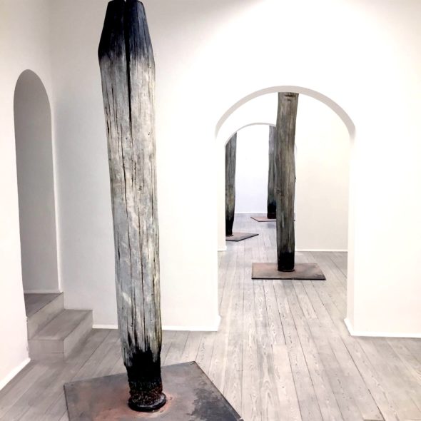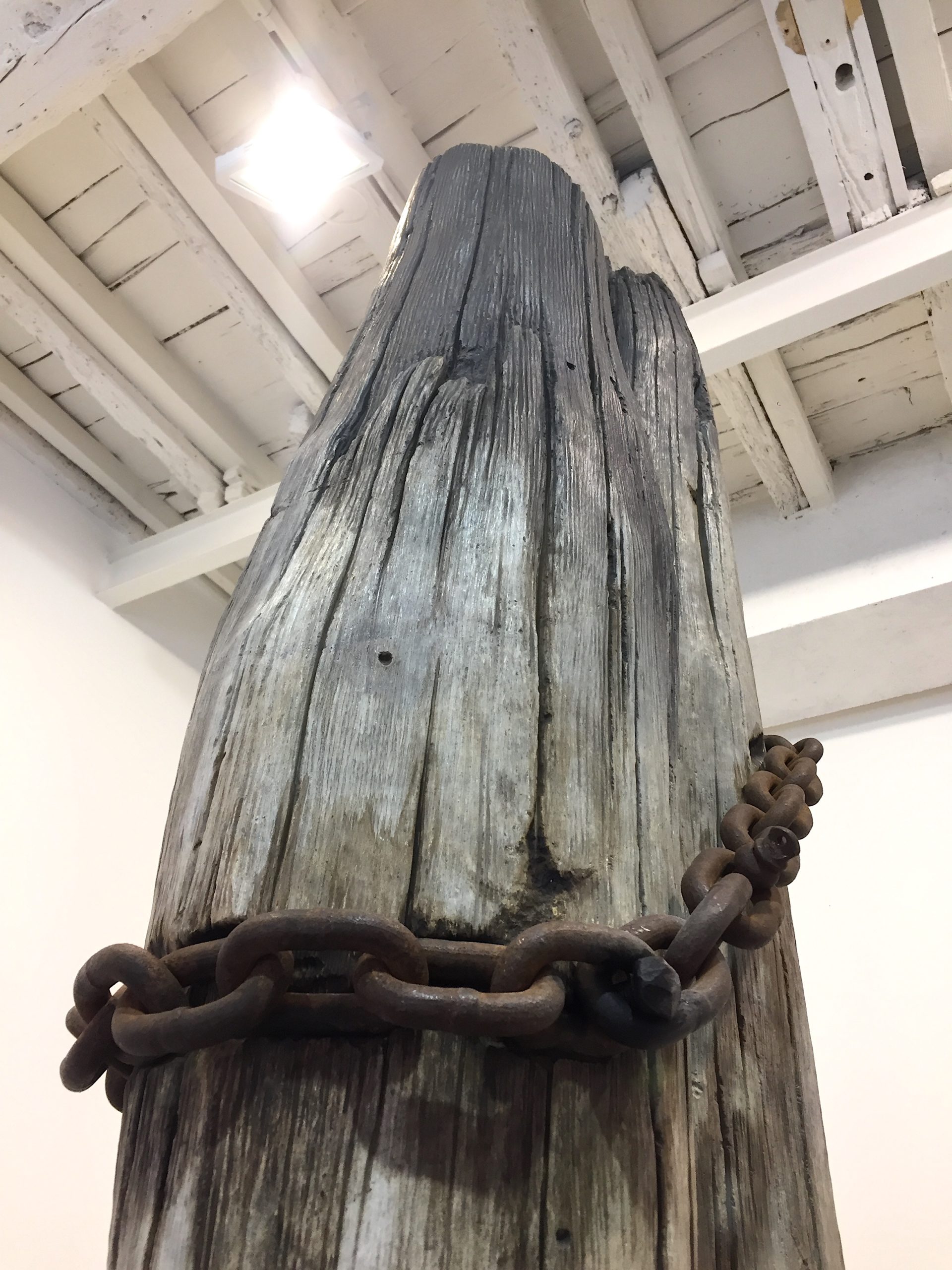 Troverete gli spazi classici total white invasi dalle briccole veneziane in scala 1:1. Enormi pali di legno che vengono adoperati per attraccare le barche e periodicamente erosi dall’acqua. Uno dei più luminosi simboli di Venezia, interpretati con la consueta maestria, per cui senza toccarli direttamente è impossibile dire che si tratti di marmo.