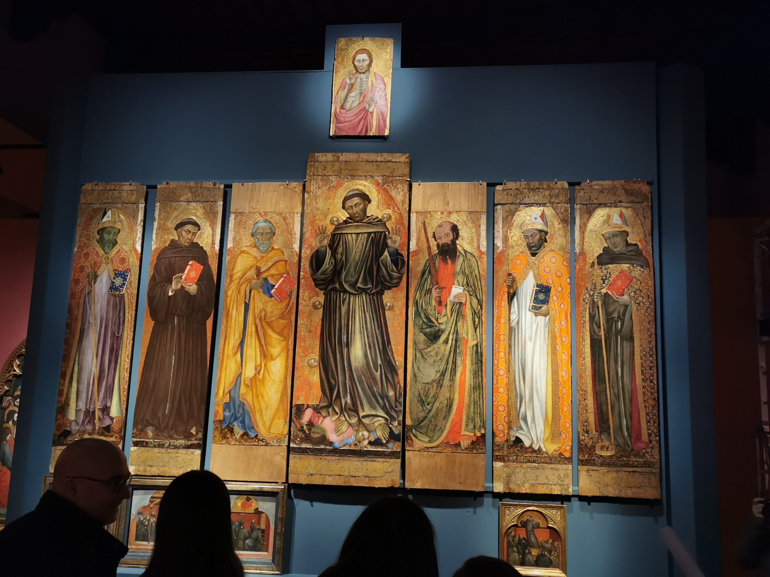 Ad aumentare l’efficacia dell’approfondimento, lo straordinario allestimento, che ricrea una chiesa francescana ad aula l’interno della grande Sala Podiani, che accoglie l’esposizione. Dove è stato ricostruita, per esempio, l’ormai smembrata pala di San Francesco al Prato di Perugia, di cui la Galleria Nazionale dell’Umbria conserva ben 13 elementi. Ricongiunti con le parti mancanti, finora individuate, come le sette tavole della predella raffiguranti Storie di san Francesco, conservate tra il Landesmuseum di Hannover (Germania) e il Kasteel Huis Berg a s’-Heerenberg (Paesi Bassi). E il piccolo San Sebastiano del Museo di Capodimonte a Napoli.