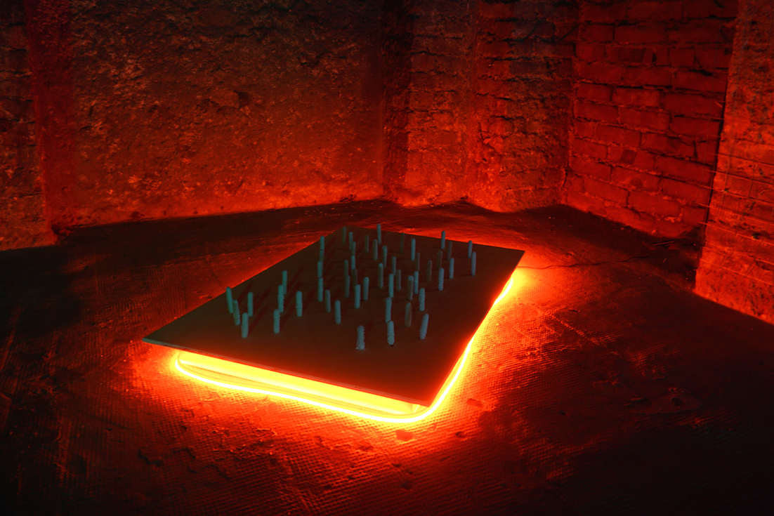 Arianna Pace vive e lavora a Pesaro. Affascinata dalla superficie terrestre e dai suoi processi di trasformazione, come un’archeologa scava e riporta alla vita testimonianze di un paesaggio, che, anche se non visibile, esiste e va preservato. Infatti mediante un trattamento sui gessetti crescono dei cristalli (Landscape, questa la formula: FE4[FE(CN)6]3) che rendono visibile qualcosa che era inizialmente invisibile.