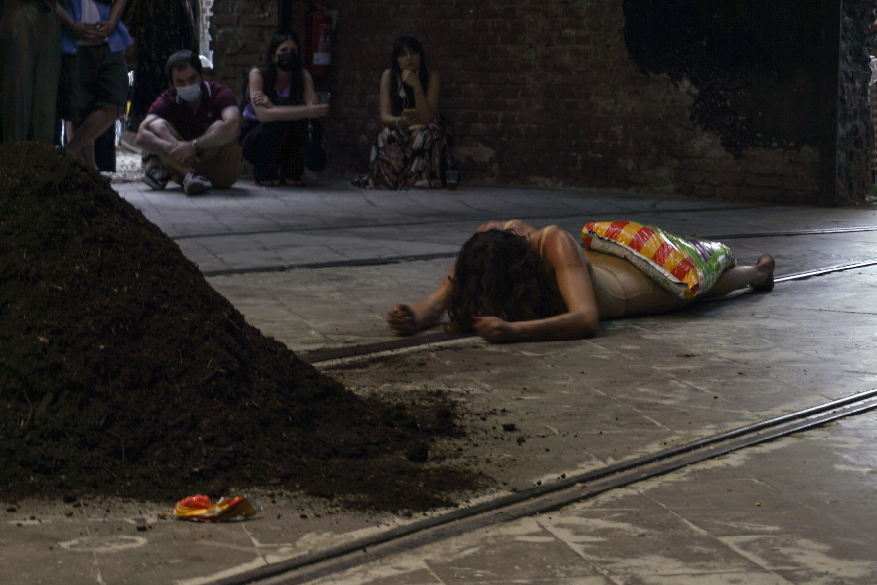 Bianca Terreni, vive e lavora a Como e Milano. Performer, sviluppa la sua ricerca attorno al tema dell’auto-sabotaggio mettendo il corpo a contatto con un elemento, annullando lo spazio che intercorre, in questo caso un cumulo di terra.