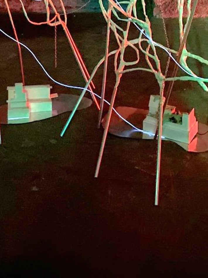Anna Bochkova, di origini russe, vive e lavora a Vienna. Da sempre attenta alle tematiche della memoria, delle migrazioni e della coesistenza sociale attraverso la narrativa architettonica, struttura lo spazio in maniera scenografica, riuscendo a costruire una drammaturgia in cui la scultura in cartapesta riveste una sua centralità. Due casette nascoste ai piedi dell’opera in cartapesta ci indicano il tema dell’abitare.