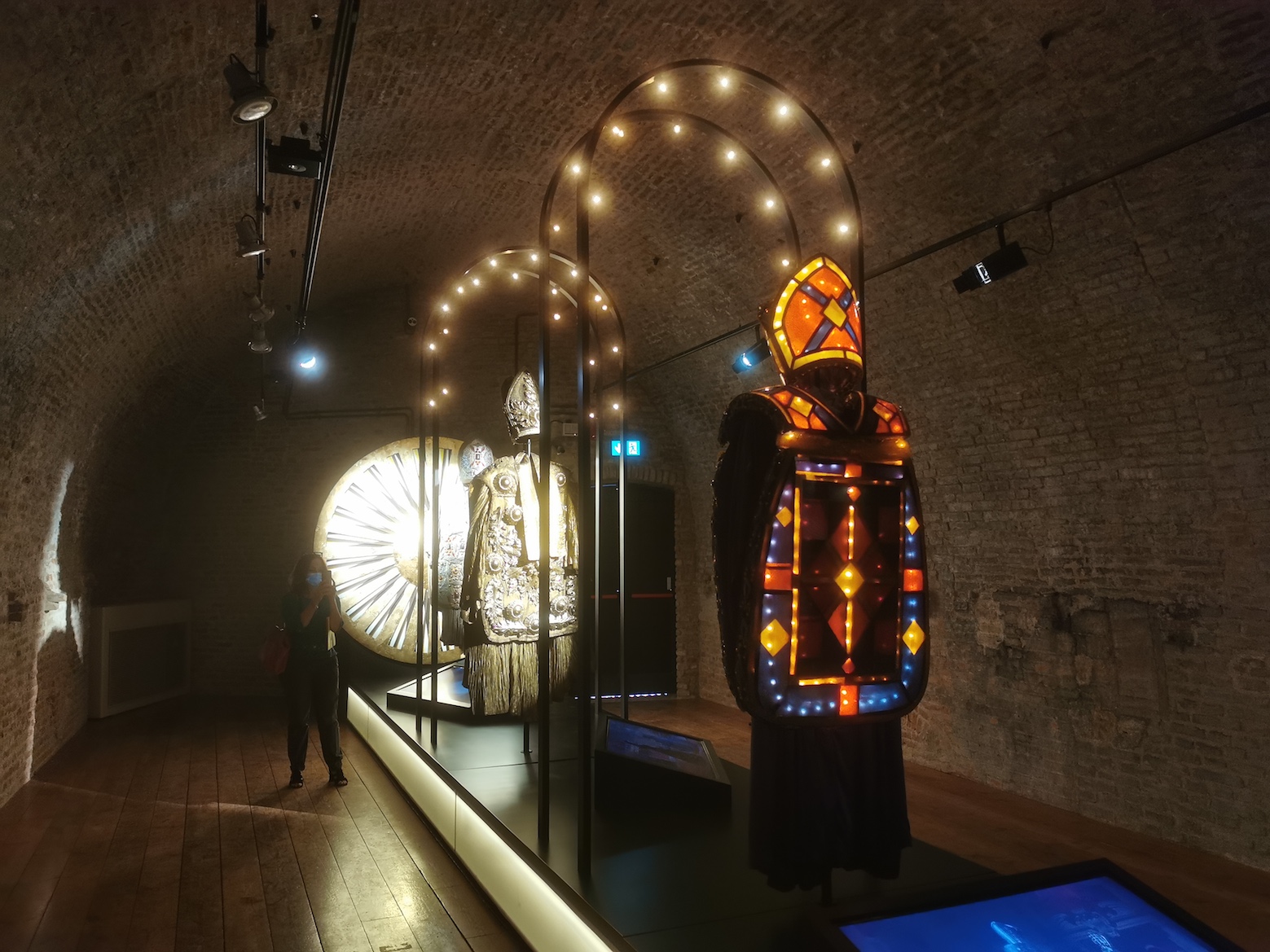 Qualche dato? La superficie espositiva totale è di circa 1.650 mq di spazi espositivi, fra le 16 sale di Castel Sismondo e i tre piani di Palazzo del Fulgor. Un progetto curatissimo fin nei minimi dettagli, certo sostenuto da investimenti importanti: pare che nel complesso il MiC abbia contribuito per una cifra di 15 milioni di euro. E un grande ruolo è quello svolto dalla multimedialità, spesso curata da Studio Azzurro: basti pensare che solo nel castello sono installati 33 proiettori, 34 monitor e 26 schermi. “Un repertorio audiovisivo unico, proposto come un percorso nel flusso creativo dell’opera di Fellini”, come si legge nelle note. “Cui si affianca un’importante sezione documentale con i disegni di scena originali, gli abiti di Danilo Donati, oggetti e fotografie, i taccuini di Nino Rota”.
