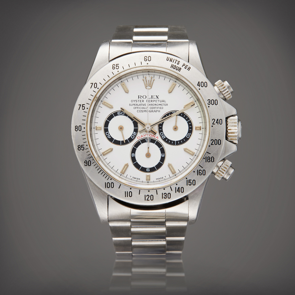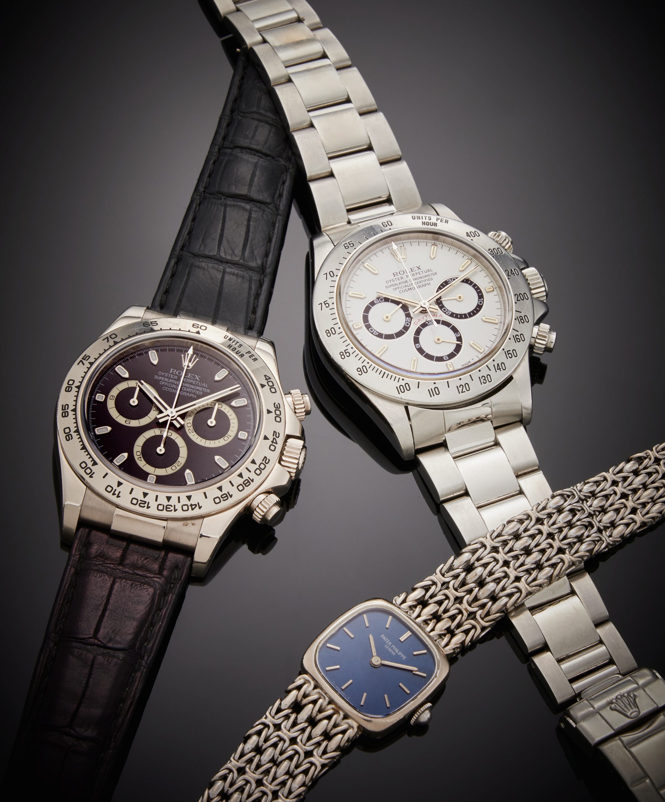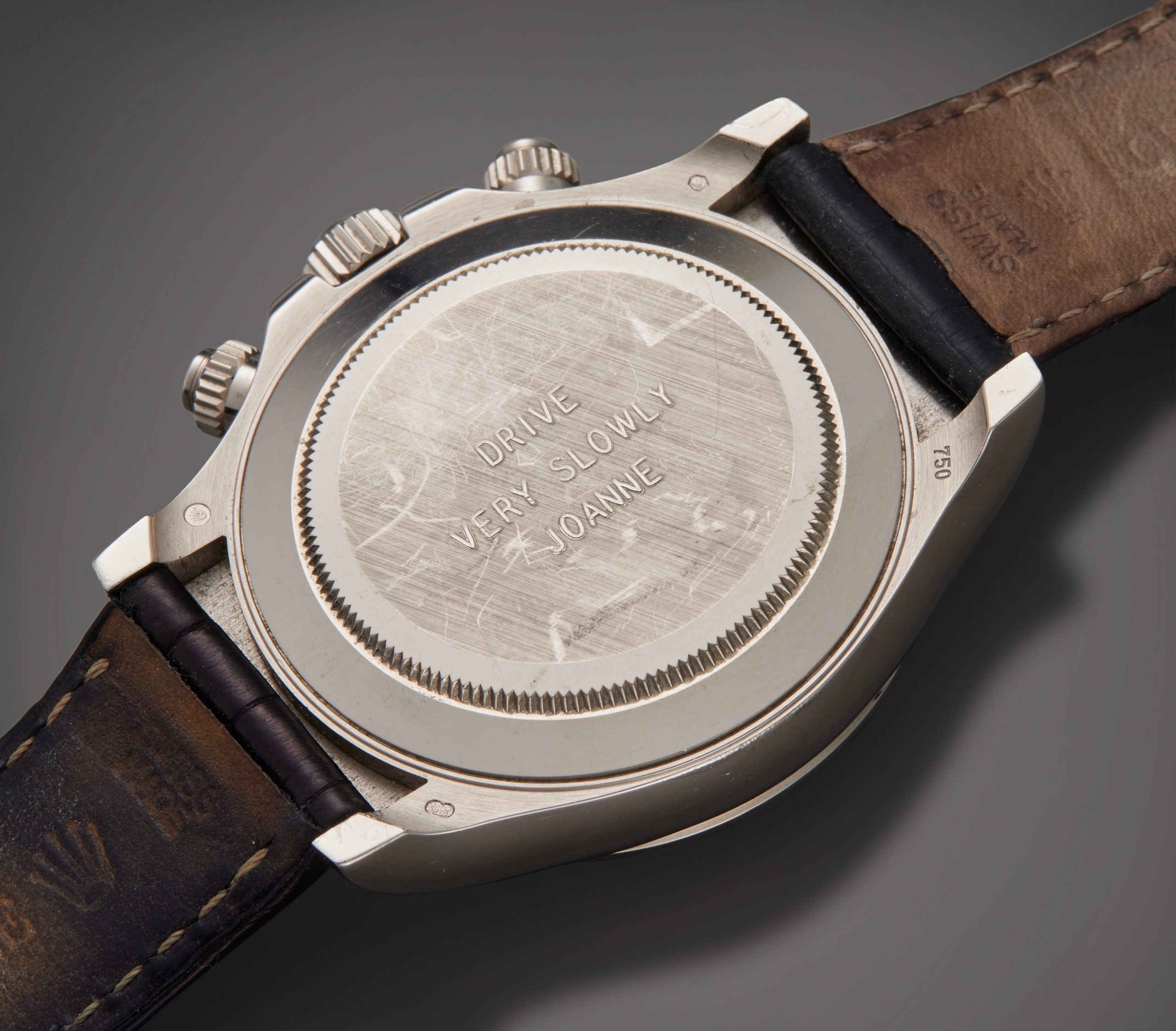 Mentre un Rolex “Paul Newman Daytona” è ampiamente riconosciuto tra i modelli Rolex vintage più ambiti, ancora più rari sono i Daytona indossati e posseduti dalla stessa leggenda di Hollywood. Quelli in arrivo in asta sono un Reference 16520 ‘Zenith’ Daytona stimato  $500,000 – 1 milione e, alla stessa stima, un Reference 116519 intriso di grande valore sentimentale: l’ultimo Daytona regalato a Paul dalla moglie con la tenera scritta “Drive Very Slowly Joanne”. Gli orologi di Paul saranno accompagnati da un Patek Philippe Reference 4459 in oro bianco appartenuto a Joanne, inciso con le sue iniziali sul fondello (stima $ 2.000 – 5.000).