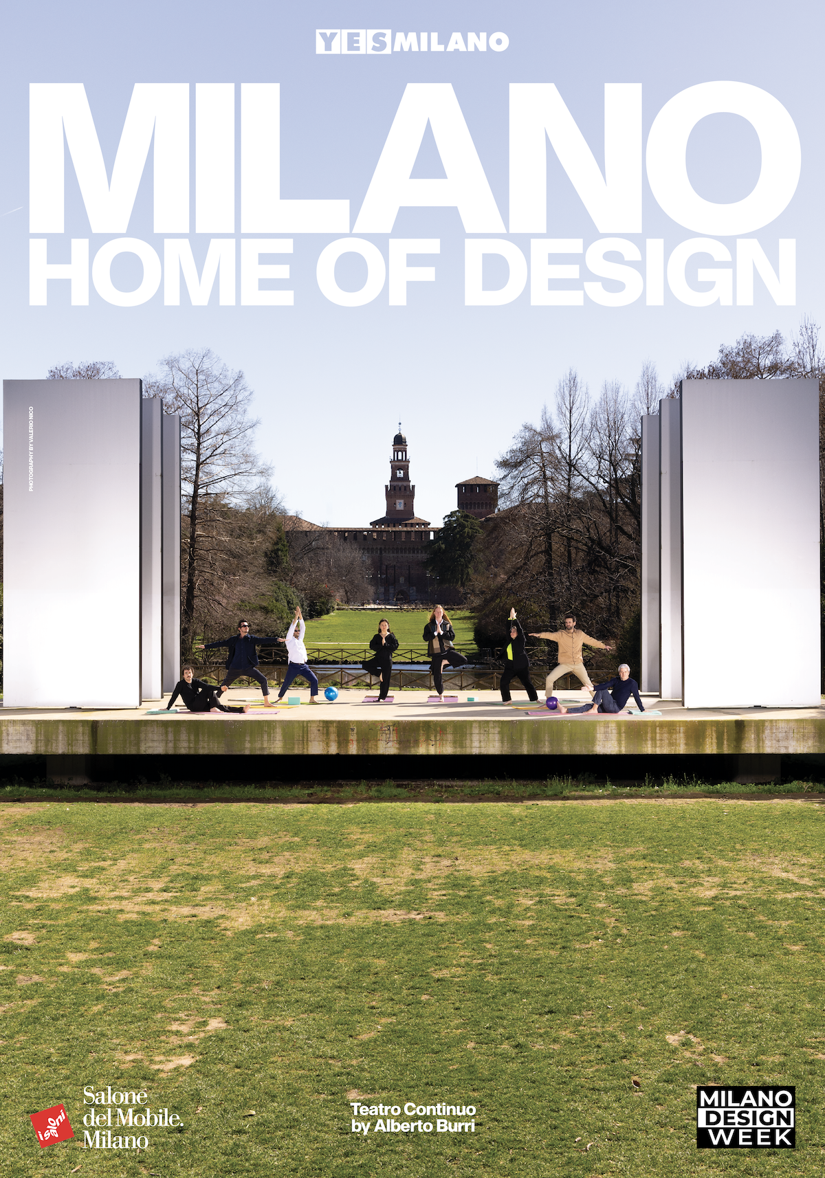 Molti si allenano al Parco Sempione, ma questa scena apparentemente normale viene decontestualizzata e caricata di significato tramite il setting iconico del Teatro Continuo di Alberto Burri. Il cast viene raffigurato nel mezzo di una seduta di yoga, in abiti da sera.