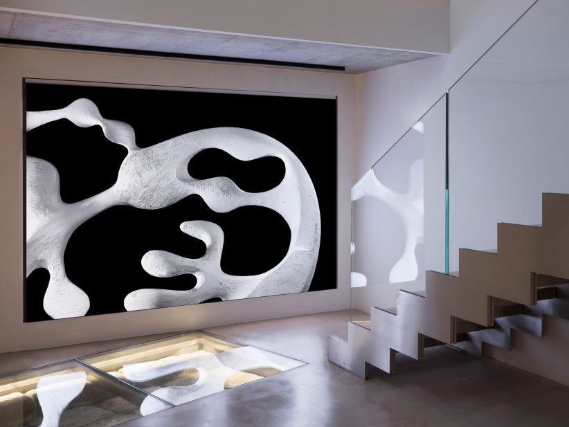 Lo Spazialismo non è solo una corrente artistica, ma una filosofia, un viaggio che trascende la semplice rappresentazione dello spazio. Come Fontana, De Toffoli non si limita a rappresentare lo spazio: lo crea, lo modella, lo rende tangibile. Le sue sculture in gesso, esposte nella navata centrale, si ergono come totem moderni, monumenti che sembrano sfidare il vuoto, creando un equilibrio perfetto tra pieno e assenza. L’altezza vertiginosa del soffitto non è più solo un elemento architettonico, ma diventa parte integrante dell’opera, invitando lo spettatore a guardare oltre il visibile.
