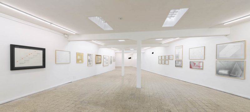 La prima realizzazione è Proiezioni cilindro, la cui originale installazione fu pensata nel 1966. Una porzione di cilindro è appena al soffitto. Se proseguiamo idealmente questa figura geometrica, partendo dalle due estremità, il volume potrebbe dilatarsi con il potere della nostra immaginazione, fino a incontrare l’ostacolo delle pareti della stanza. Due cerchi schiacciati sono, infatti, tracciati sulle due superfici murarie opposte come fossero le ombre lasciate da un cilindro effimero, capace potenzialmente di tagliare lo spazio sopra le nostre teste.