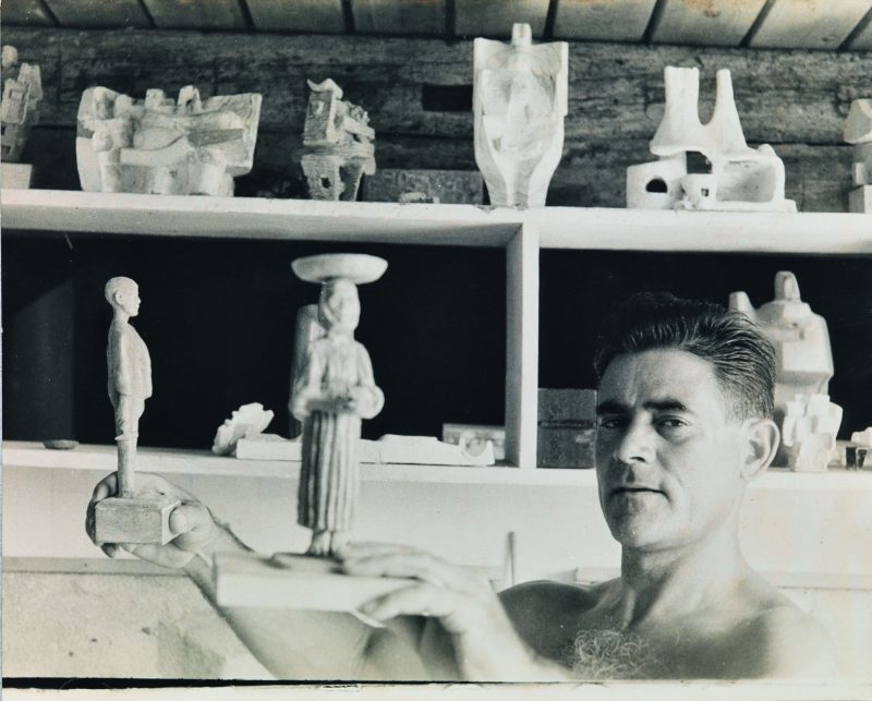 Si passa così dallo studio per fontana monumentale – gioco meraviglioso di negativi e positivi visibile in marmo e filo di rame in mostra e dal vivo, come realizzazione postuma, sotto lo spazio del vecchio lavatoio, nello splendido giardino del complesso museale di Orani – alle creazioni per l’Università di Yale ai blocchi dell’area ricreativa delle Stephen Wise Tower a New York, simili al modello di vasca con scultura del 1956 per l’Ambasciata USA a Baghdad, ai confronti con Su Tempiesu e di Irru, siti di trenta secoli fa. Tra le opere esposte figurano anche sospesi progetti, come quello di Gea e Urano, simbolo di incontro tra cielo e terra, tra uomo e donna. Al tema della figura femminile, presenza costante nella ricerca di Nivola, è dedicato un ampio capitolo dell’esposizione, intessendo un confronto tra queste e le raffigurazioni di dea madre della preistoria. In esso si riflettono gli idoli dello scultore con divinità di sei millenni or sono, emblemi dai tratti sessuali sintetizzati o marcati – nei fianchi, nei seni, simbolo di prosperità e fecondità – che emergono nelle planari forme plastiche delle divine madri così come nelle rotonde e sensuali ceramiche incise e antropomorfe e nei disegni in cui il candido profilo con al centro l’ombelico rivela l’ombreggiatura del ventre. All’immagine femminile lo scultore contrappone quella maschile, il costruttore, “erede dei lontani artefici dei nuraghi, e scorge nell’idea di costruzione l’essenza stessa dell’arte”. Alla civiltà nuragica è associata la serie Buildings blocks, che riprende le torri del II millennio a.C. e i blocchi che costituiscono le squadrate forme umane sono come gli incastri dei muri a secco. Così nasce il confronto tra la piccola statuaria dell’età del bronzo – le presenze studiate da Christian Zervos e definite come “del tutto barbariche” da Winckelmann – e le enigmatiche figure d’argilla dell’artista, modellate durante il suo ultimo decennio di vita creando “guerrieri, sciamani e pastori“ e ancora “il muratore, l’artista, l’architetto”. A queste si associano Gli Antenati, invenzioni degli anni Cinquanta, che già allora portano sul capo – o al posto del capo – la tegola rovesciata che hanno i costruttori di Nivola, così simili ai curvi scudi dei pugilatori e degli eroi del Sinis.
