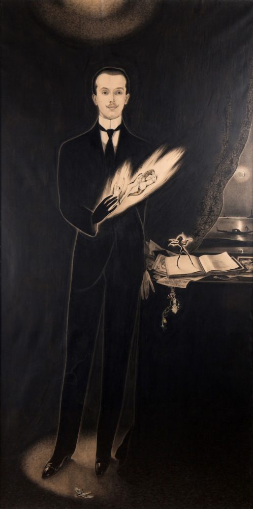 La mostra si apre con il biglietto da visita dell’artista che riporta la sua espressione corrucciata circondata da figure mostruose. Questo è fronteggiato dal lucifero vermiglio con la testa di gorgone che introduce il visitatore a un inframondo costituito da visioni orrorifiche e ctonie in perenne trasformazione, dove ogni sogno può diventare incubo e la morte incombe sulla bellezza fino a sconfinare nel grottesco. Il percorso prosegue con i dipinti Nel sonno, Diavolessa e Notturno, esposti durante la VII Biennale di Venezia. Un esempio di quella ”eleganza sottile” che caratterizzava la sua persona e che da subito colpì il critico Vittorio Pica, grande sostenitore della sua opera.