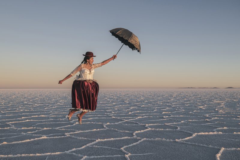 Marcelo Perez del Campo, Jhovana, a young cholita from the “Warmi Empollerada” project, appears to fly with an umbrella over the Uyuni Salt Flats, the largest in the world, on June 25, 2023.