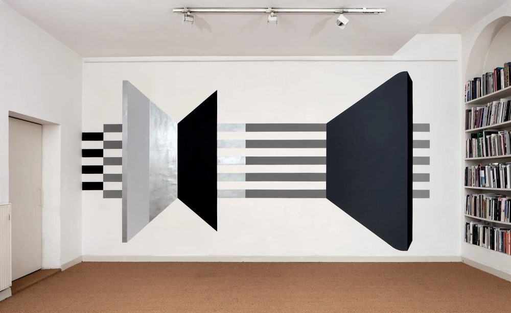È una prospettiva frantumata, segmentata in campiture monocrome, che sembra essere sempre in procinto di collassare, di crollare e far crollare le certezze dello spazio. Ecco, forse, che questo librone, nero, imponente è alla fine uno spazio di spazi, qualcosa che resta in bilico tra conclusione e aspettativa. Uno strumento con cui l’artista sfida le leggi della permanenza, come dice in conclusione Claudia Gioia, e inventa un tempo: “Cognitivo e inesistente, capace di trasformare un’idea in forma”.