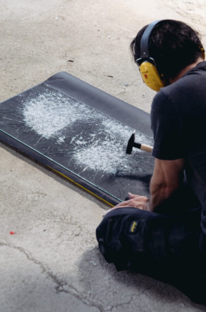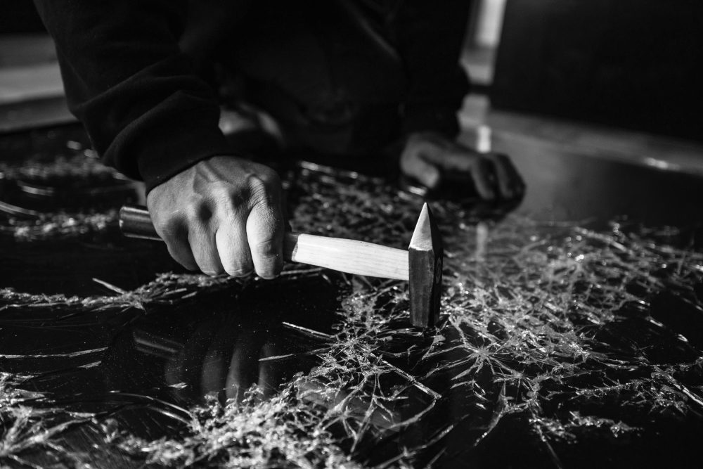 Scolpire il vetro di sicurezza come fosse una duttile tavola di legno, ovvero batterlo, incidendolo, con un martello che sa dosare colpi ravvicinati o distanziati, brevi o allungati rappresenta una grande sfida. L’intensità del gesto si modula infatti a seconda del disegno progettato, fino a far emergere dalla superficie un volto, un occhio, un segno figurativo o anche astratto, che si evidenziano nella loro precisione grazie al gioco della luce e alle angolazioni dello sguardo. Operazione complessa poiché alla frantumazione “controllata” si accompagna la difficoltà della trasposizione del pensiero attraverso colpi mirati, senza possibilità di correzione o ripensamento.