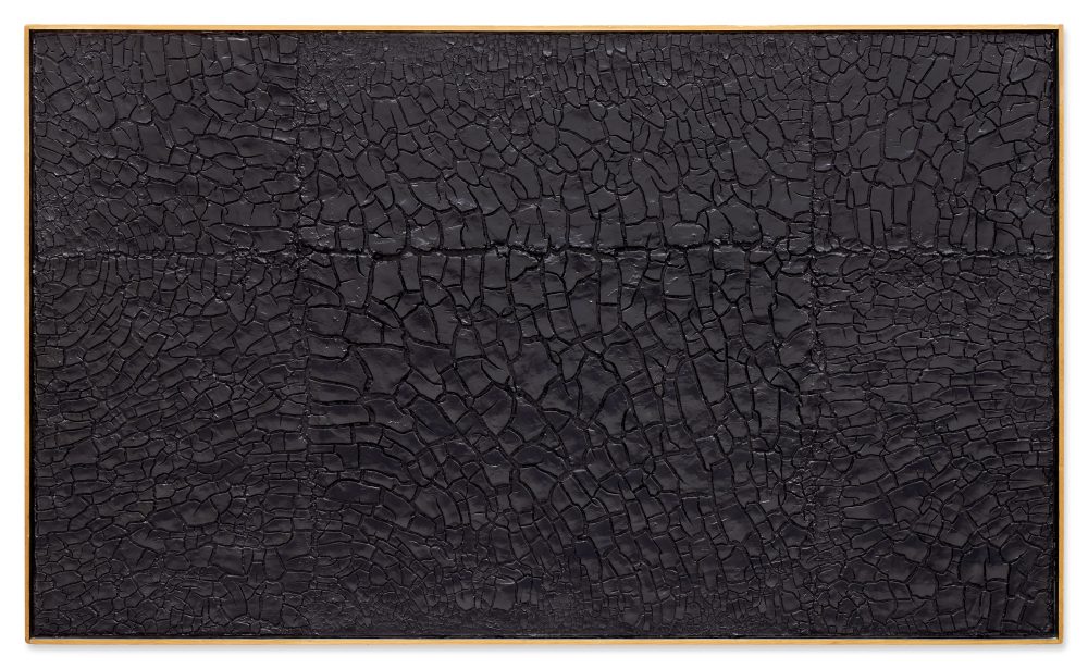 Nero Cretto (stima 2,5-3,5 milioni di dollari) è invece il primo esemplare monumentale dell’omonima serie di Alberto Burri ad essere offerto in asta negli ultimi 15 anni, e uno dei più grandi mai presentati sul mercato secondario. Inoltre, dei 37 Cretti monumentali, solo 19 sono stati realizzati in nero. Creati tra il 1970 e il 1979, i Cretti rappresentano l’apice della sperimentazione materica di Burri, che ottenne le fenditure manipolando le proprietà chimiche del bianco di zinco unito all’acetato di polivinile (PVA), un legante resinoso che faceva crepare la densa materia durante l’asciugatura. Sebbene il risultato emergesse in modo spontaneo, Burri manteneva un controllo compositivo preciso, incidendo e modellando la superficie per guidarne la formazione, in un equilibrio tra casualità e intervento volontario.