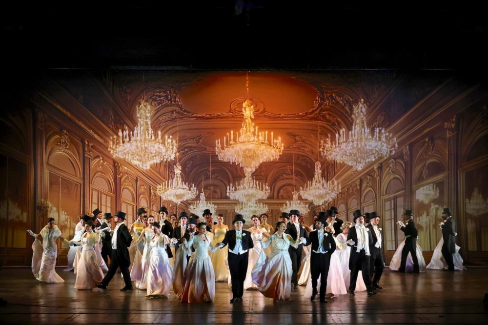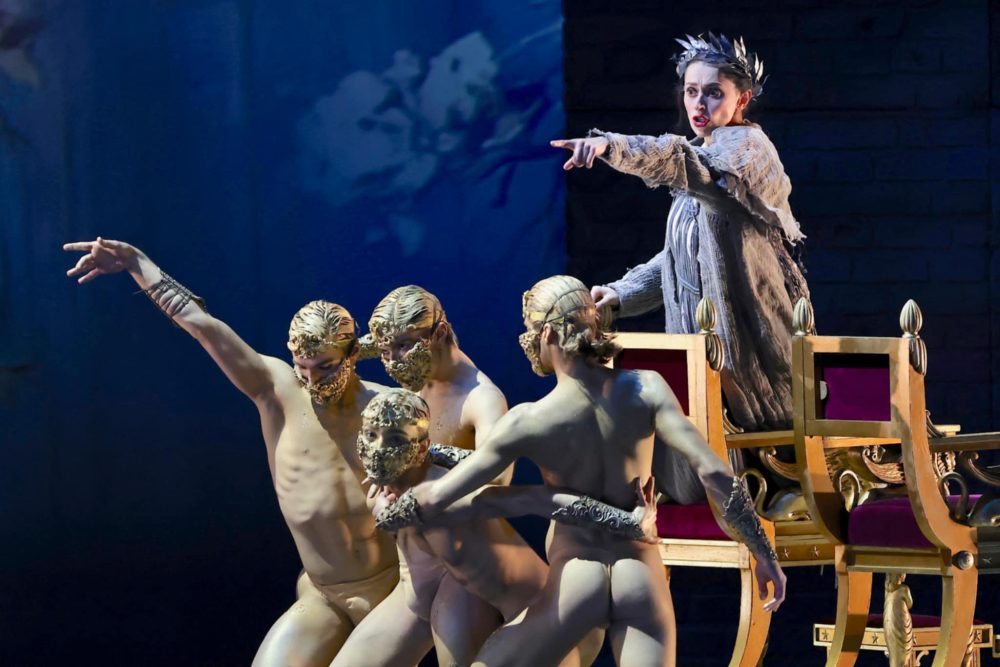L’allestimento presentato al Carlo Felice con la regia di Laurence Dale predilige una visione satirica degli dei dell’Olimpo, contapposta alla trgedia della guerra che appare sin prima che partano le note dell’opera con una grande proiezione che mostra la data del 1944 e tutti i bombardamenti in atto in quel periodo. In scena anche due figure che rappresentano il compositore con la moglie che si aggirano mesti tra le rovine( i mimi Erika Melli e Roberto Pierantoni). La scenografia ad opera di Gary McCann contappone anch’essa il lusso del palazzo del re alle rovine della guerra (un pianoforte a coda rovesciato sul lato sinistro del proscenio). All’interno di questo mondo irreale si aggirano quattro danzatori seminudi, tinti in oro, che si muovono con fare sinuoso intorno a tutti i personaggi dell’opera. Un’idea che sarebbe anche stata buona se non fosse durata troppo. Vale a dire che il loro essere continuamente in scena è distraente ai fini della storia e soprattutto del canto. Meglio sicuramente l’introduzione della danza che riguarda i vari valzer presenti nell’opera che ci mostra l’alta qualità dei ballerini del Balletto Fondazione Formazione Danza e Spettacolo “For Dance”, già apprezzati nell’opera Andrea Chenier presentata a febbraio.