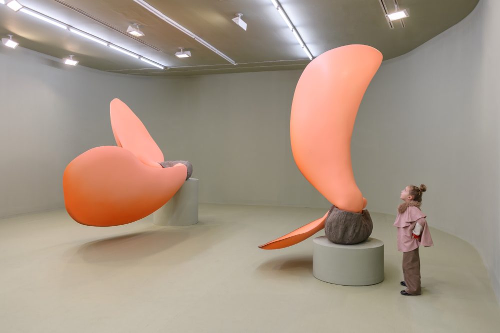 Bird Dream Machine è invece il titolo della mostra di Teresa Solar Abboud (Madrid, 1995). La sala espositiva a lei dedicata è qui abitata da alcune strutture di grandissime dimensioni, di cui non sapremmo se collocare l’origine nel mondo del mito, dell’organicità naturalistica (talpe giganti o forse balene?) o del reperto industriale. Le sculture sono strutturate come sorta di eliche zoomorfe, le cui curve sembrano alludere ad un possibile movimento, creando una sorta di vortice ideale sia nel modo in cui interagiscono l’una con l’altra, sia, teoricamente, nel moto delle forme che compongono ciascuna di esse. L’impatto visivo è potente e l’impressione emotiva carica di energia, ma in un contesto elegante ed esteticamente armonioso.