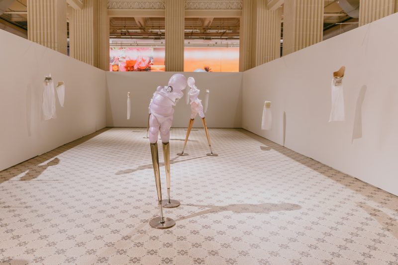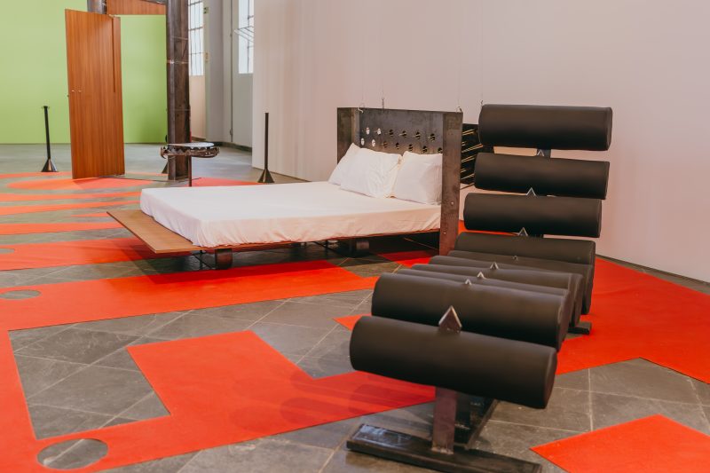 Tra gli artisti qui presenti c’è Marcus Deusdedit (1998), formato in architettura che, ci racconta, sta cercando un approccio sempre più stretto nell’interazione tra arte visiva, design e, appunto, lo spazio architettonico: nella sua installazione un grande letto, un tavolino e un sofà razionalista nascondono insidie sanguinarie, aprendo una riflessione anche sulla differenza del tempo libero rispetto alla razzializzazione dell’arredamento. Qui è presente anche una installazione dell’argentino Gabriel Chaile (1985), già alla 59.ma Biennale di Venezia, all’Arsenale, per riflettere sulle interazioni tra cucina e politica.