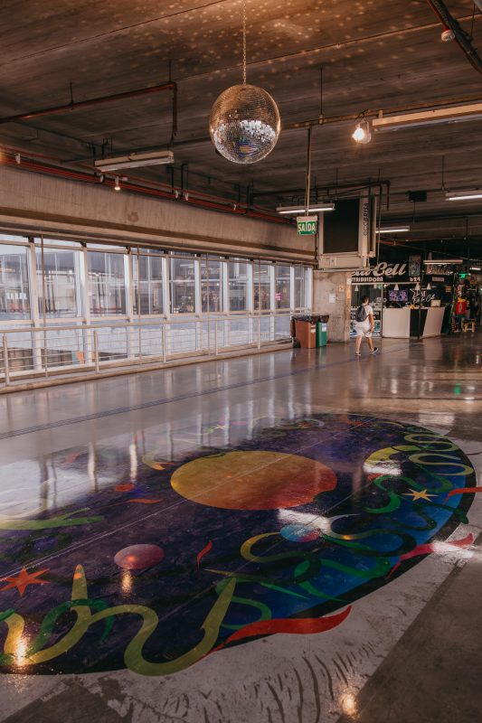 Più nella dimensione di un playground, anche in funzione della propria identità dell’edificio come area di riposo nei momenti liberi dei lavoratori del centro storico, allo Espaço Força e Luz, Fátima Rodriguez invita non solo a sentirsi in casa togliendosi le scarpe su un tappeto di dimensioni ambientale da lei stessa cucito, ma anche a cantare con una macchina del karaoke tipica del divertimento dei giovani latini, mentre Ad Minoliti crea una pittura murale dalle geometrie giocose e dai colori molto politici, contrastando con le percezioni tra quelle che sono le forme di potere e i loro effetti anche subliminali.