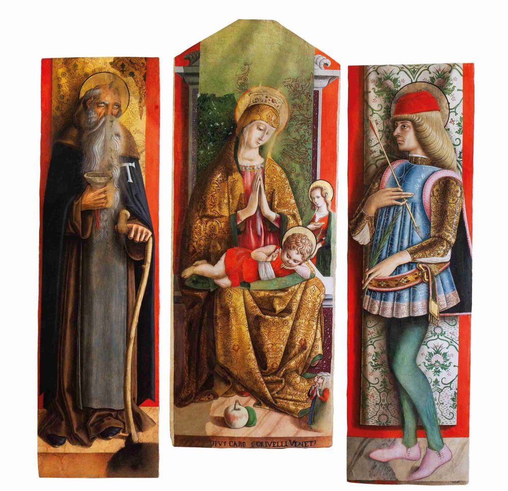 Preziosi, aulici, delicati sono tre dittici ancora inquadrati nell’originaria cornice con Santi, parti di un polittico, firmato e datato 1462, opera dei veneti Antonio e Bartolomeo Vivarini (non sono ancora chiari gli interventi reciproci), per l’altare della chiesa gotica di San Pietro a Monte dell’Olmo (attuale Corridonia), oggi nella Pinacoteca parrocchiale della città. Un polittico dalla lunga storia, idealmente ricostruito. Di capolavoro in capolavoro si arriva al secondo trittico di Valle Castellana di Carlo Crivelli (Venezia, 1430 circa-Ascoli Piceno? 1494-1495) un pittore noto, che, dopo aver soggiornato a Fermo, dove era giunto nel 1468 da Zara, si era trasferito nel territorio di Ascoli, dove aveva dipinto due trittici per poi dedicarsi dal 1473 al grandioso polittico della cattedrale.