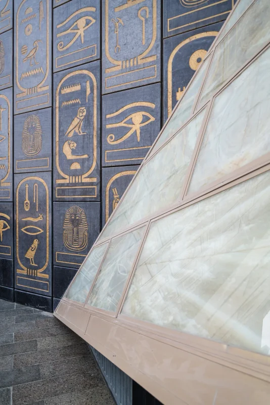 Progettato dallo studio Heneghan Peng Architects di Dublino, il museo è un capolavoro architettonico dal forte impatto visivo: linee pure, superfici scolpite dalla luce, una geometria che richiama i canoni dell’antico Egitto pur parlando un linguaggio assolutamente contemporaneo. Il suo ingresso piramidale, tutt’altro che discreto, introduce i visitatori a un viaggio nel tempo.