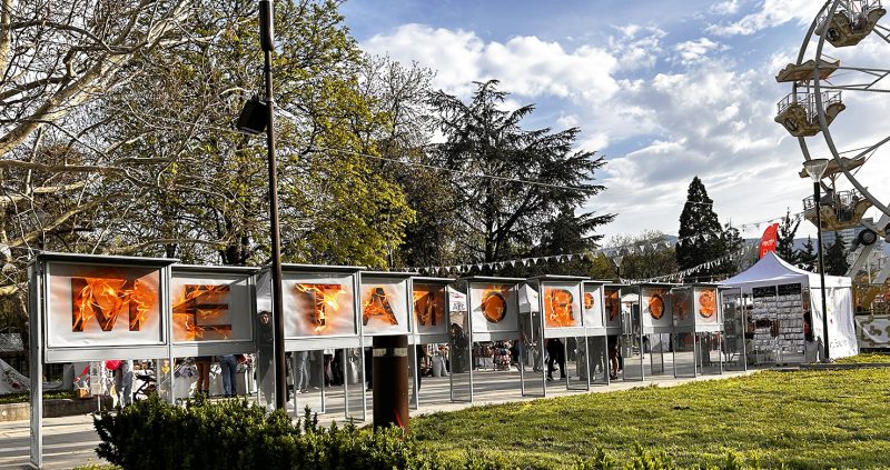 Il fuoco incendia la parola Metamorphosis, ciascuna lettera che la compone comprende qualcosa di travolgente, proprio come il fuoco, che può purificare, distruggere, riscaldare, cuocere cibi, fondere oro e metalli, trasformare diversi materiali in qualcos’altro. Il suo fuoco alchemico incarna l’energia ideologica e concettuale di un’artista che, presentando Metamorphosis, una installazione urbana promossa dall’Istituto Italiano di Cultura di Sofia (Bulgaria) all’esterno, in un luogo di transito nevralgico della città, visualizza concettualmente stati di cambiamento di una società che sta cambiando, come i suoi cittadini.