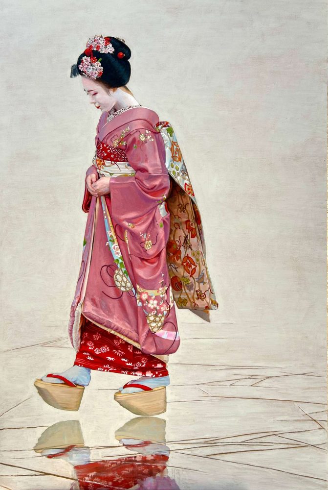 La Maiko, già utilizzata alte volte da Fabrice de Nola, qui acquista, in un certo senso, la funzione inversa da un’altra famosa donna in kimono, la Madame Monet danzante con il ventaglio di Claude Monet (Camille Monet in costume giapponese,1876, olio su tela, 231,8X142,3 cm, Boston Museum of Fine Arts) poiché qui non vi è alcuna chiusura o apertura di una soglia dinamica, non c’è nessuna ambiguità semantica a mettere in crisi la rappresentazione, bensì si imposta come una chiara affermazione. La netta contiguità tra zone piatte, in cui stendere la preziosità monocroma o contrarre la catastrofe decorativa, è funzionale chiaramente a un tema unitario.